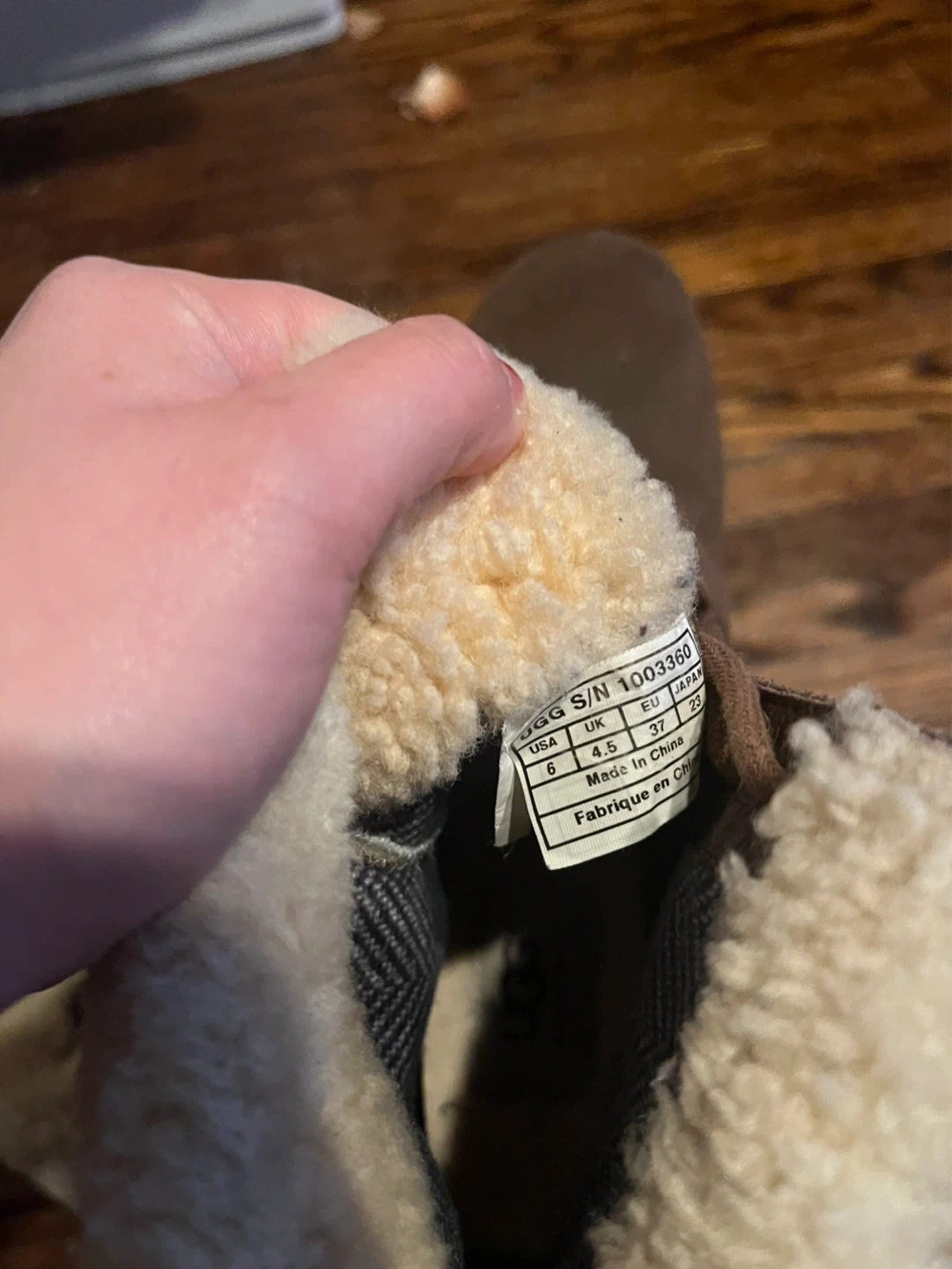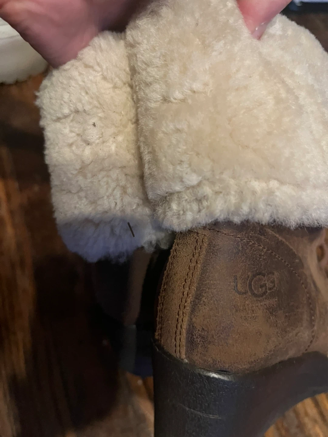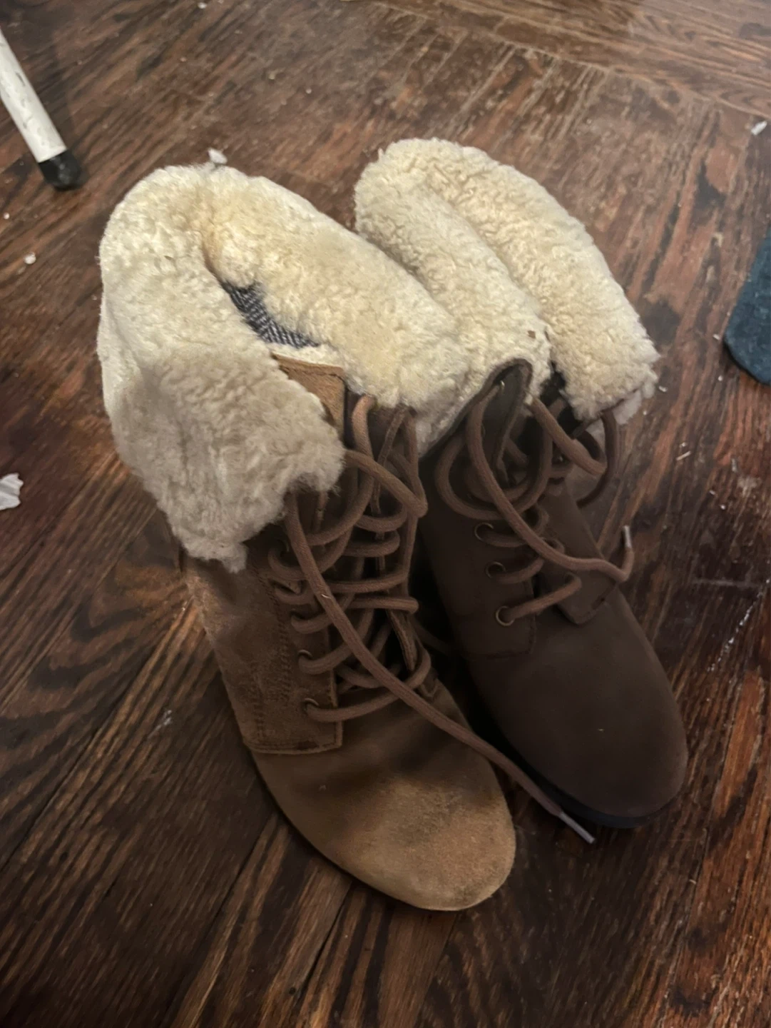 Warm and stylish brown suede wedge boots by Ugg. They feature a cozy shearling trim and lace-up closure. Perfect for keeping your feet toasty during colder weather!