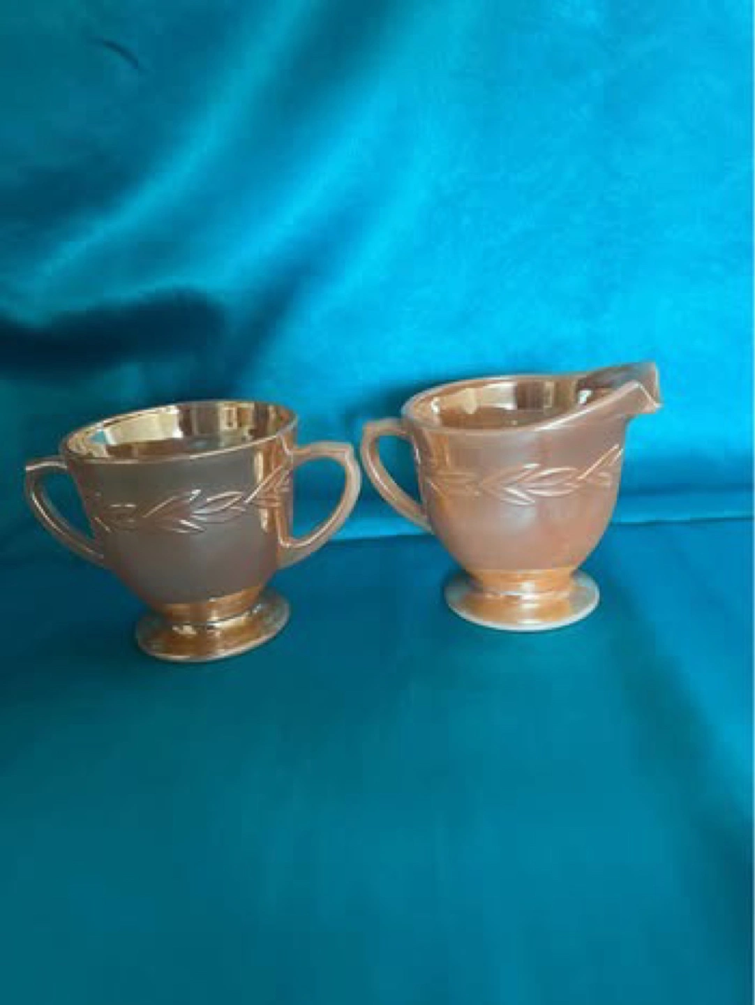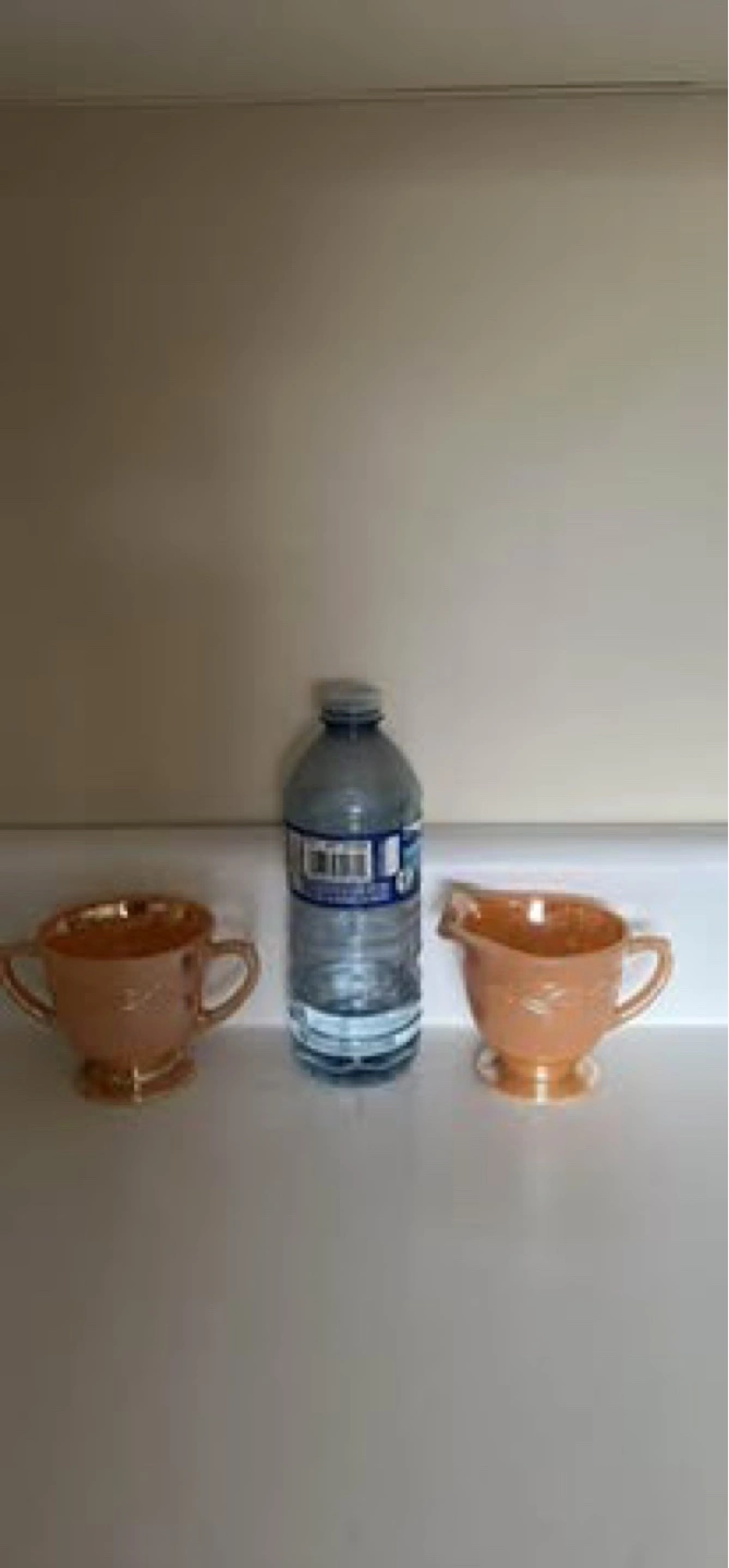 65Vintagew Anchor Hocking Fire King Peach Luster Laurel Leaf Cream and Sugar Set 💰$30 Serious buyers only, please. No free items available. All proceeds will be donated to charity 👉 Check out my other listings for more great deals!