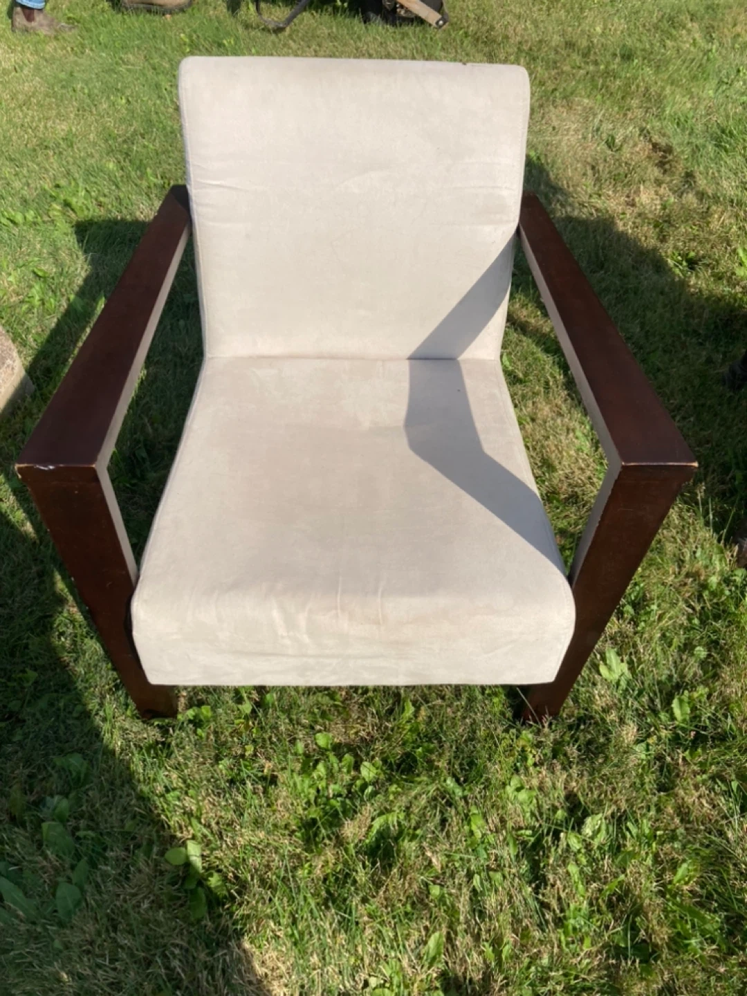 60Selling an accent chair. It features a light beige/cream seat and backrest, complemented by a dark wood frame. It's in good condition and would be a great addition to any living space