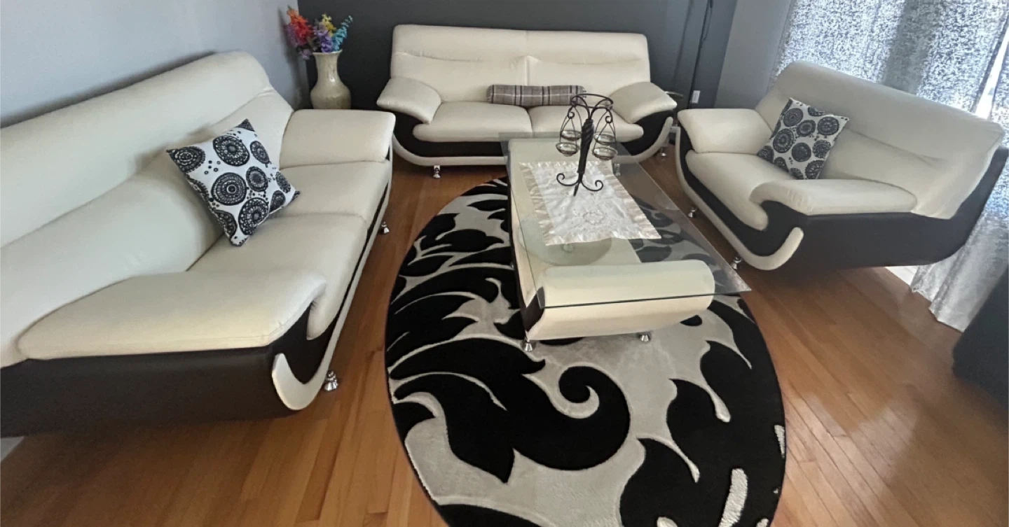 Selling a cream and black leather sofa set. Includes a three-seater sofa, a two-seater sofa, and an armchair. The set is in good condition and would be a great addition to any living room
