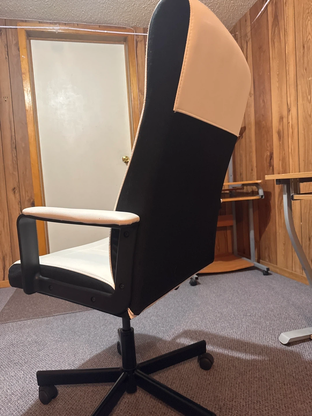 Selling a comfortable office chair in cream and black! It's in great shape and ready to provide support for your work or study space. The chair features a high back and armrests for added comfort.