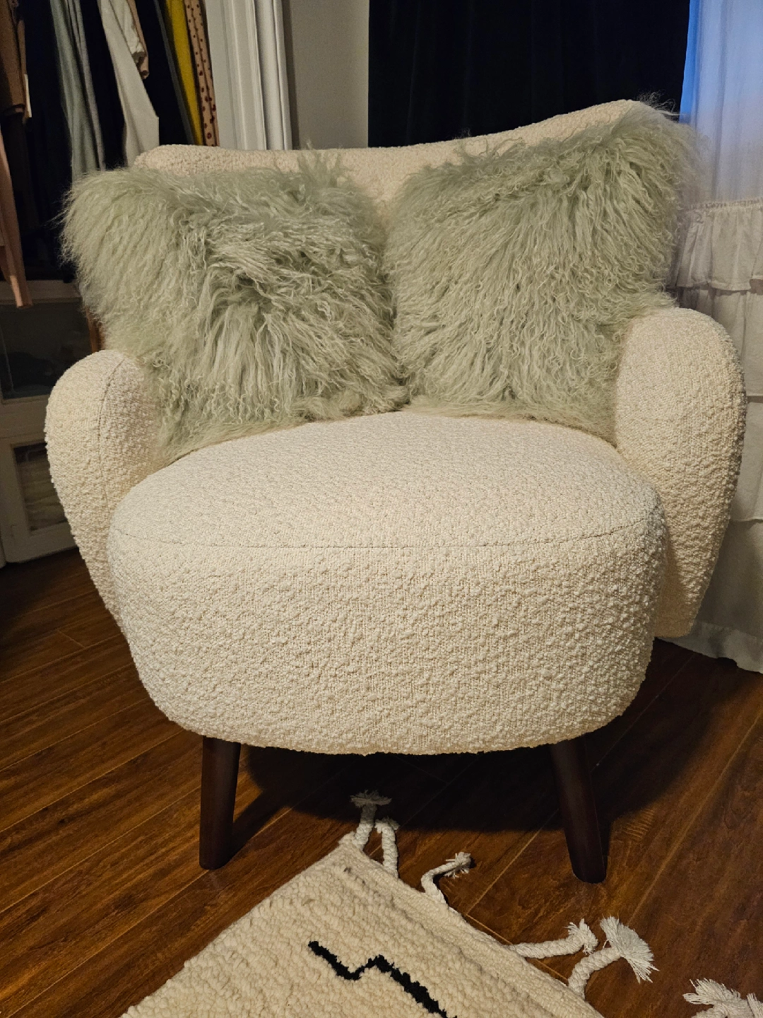 10Selling a cream boucle accent chair in excellent condition. This chair, featuring a rounded seat and back supported by dark wooden legs, is designed to enhance the aesthetic of any living space.