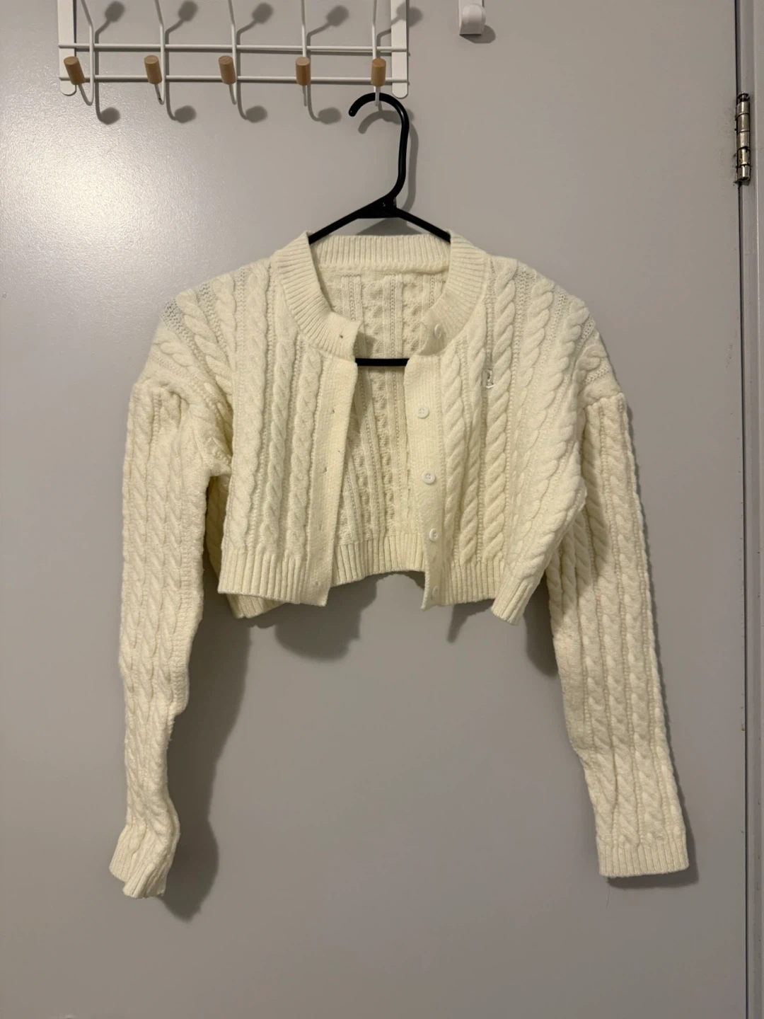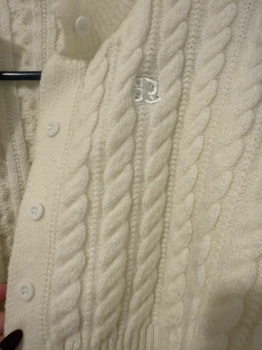 128Selling a cute cream cable knit cardigan! It's in great condition and perfect for layering. The cropped style is super trendy and the cable knit adds a cozy touch