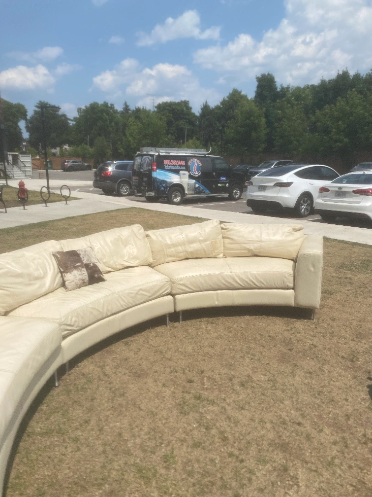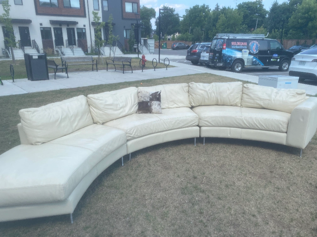 Selling a cream-coloured curved sectional sofa. It's in good condition and would be a great addition to any living room! The sofa has a unique curved design and is made of a comfortable material.please call 9058181553