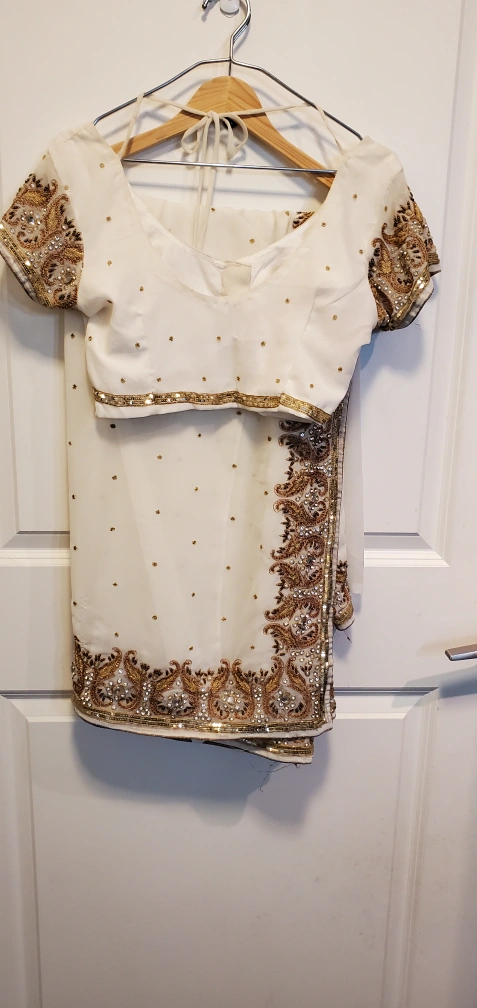 This is a beautiful cream sari with gold and brown embroidery. It is a great choice for special occasions. Blouse can be opened to fit larger size. #sari #saree #indianclothing