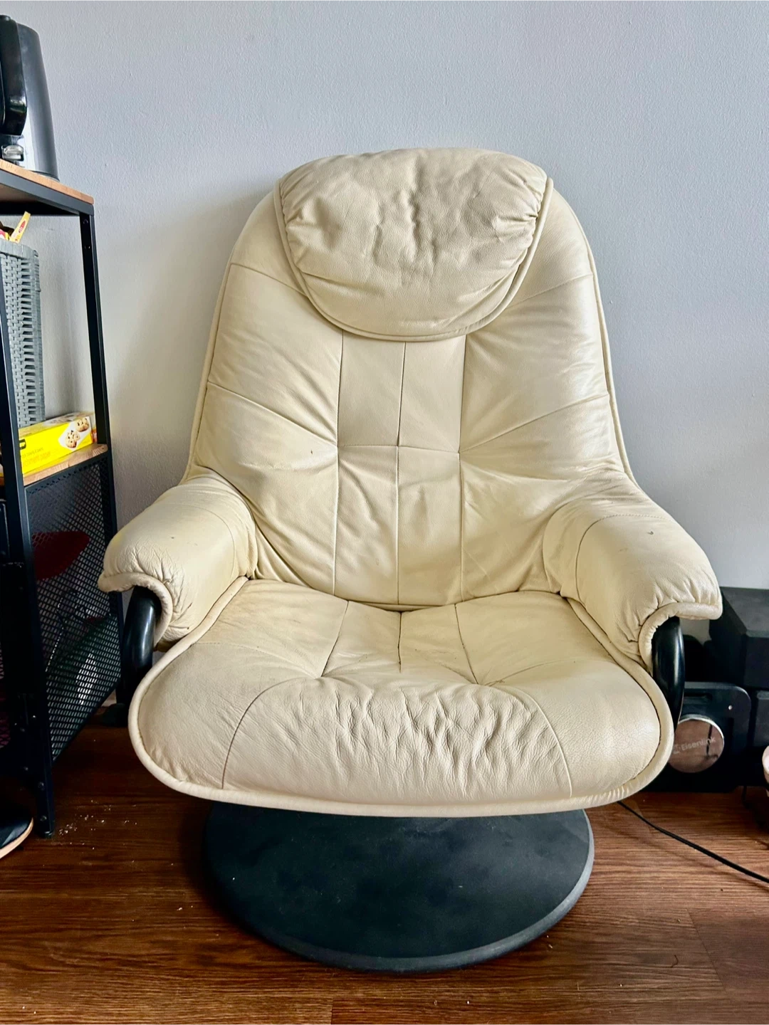65Selling a comfortable cream colored leather swivel chair with a matching ottoman. It's perfect for relaxing and unwinding after a long day. The chair and ottoman both have a sturdy base and are in good condition!