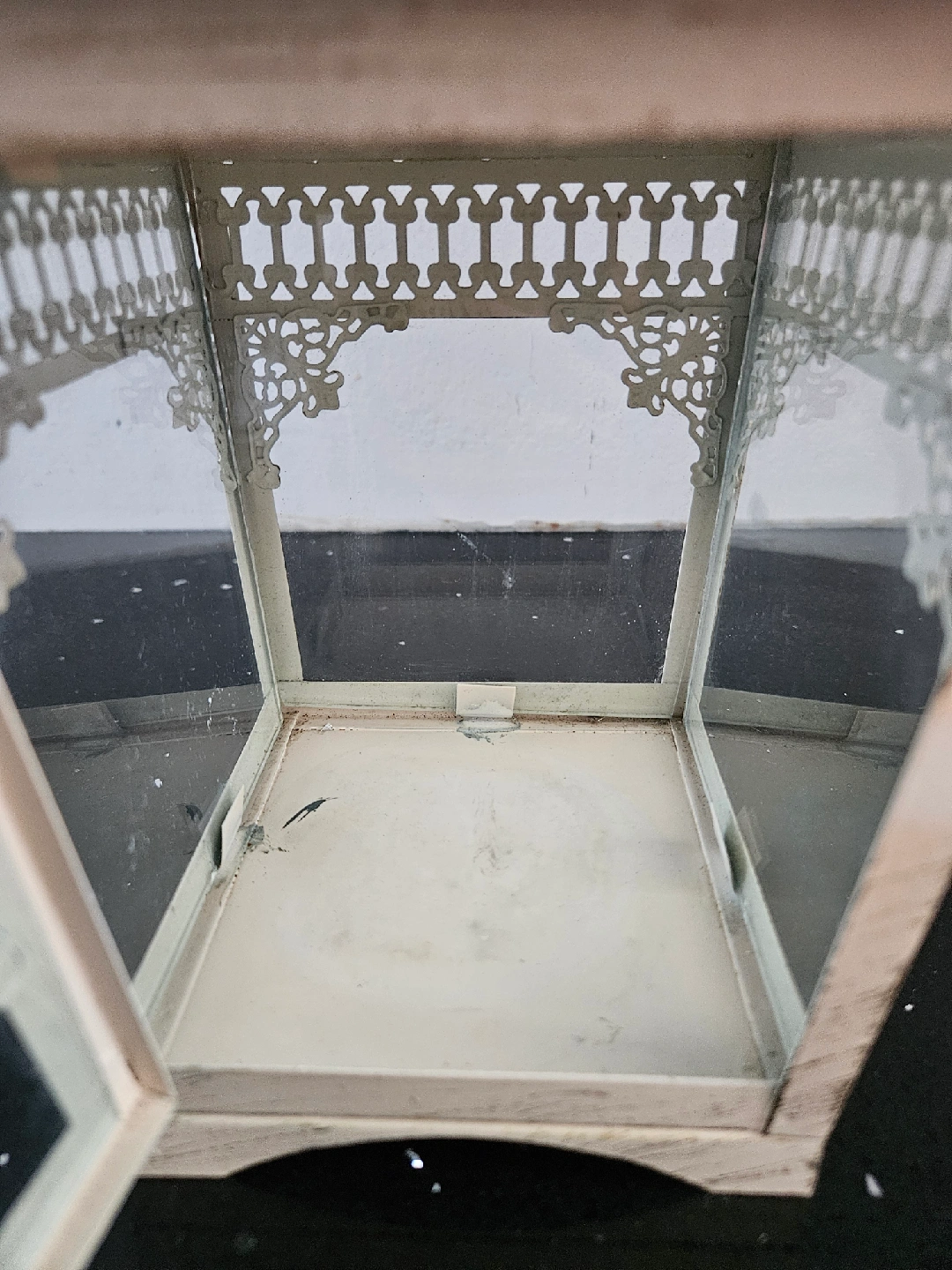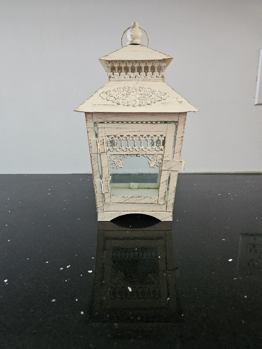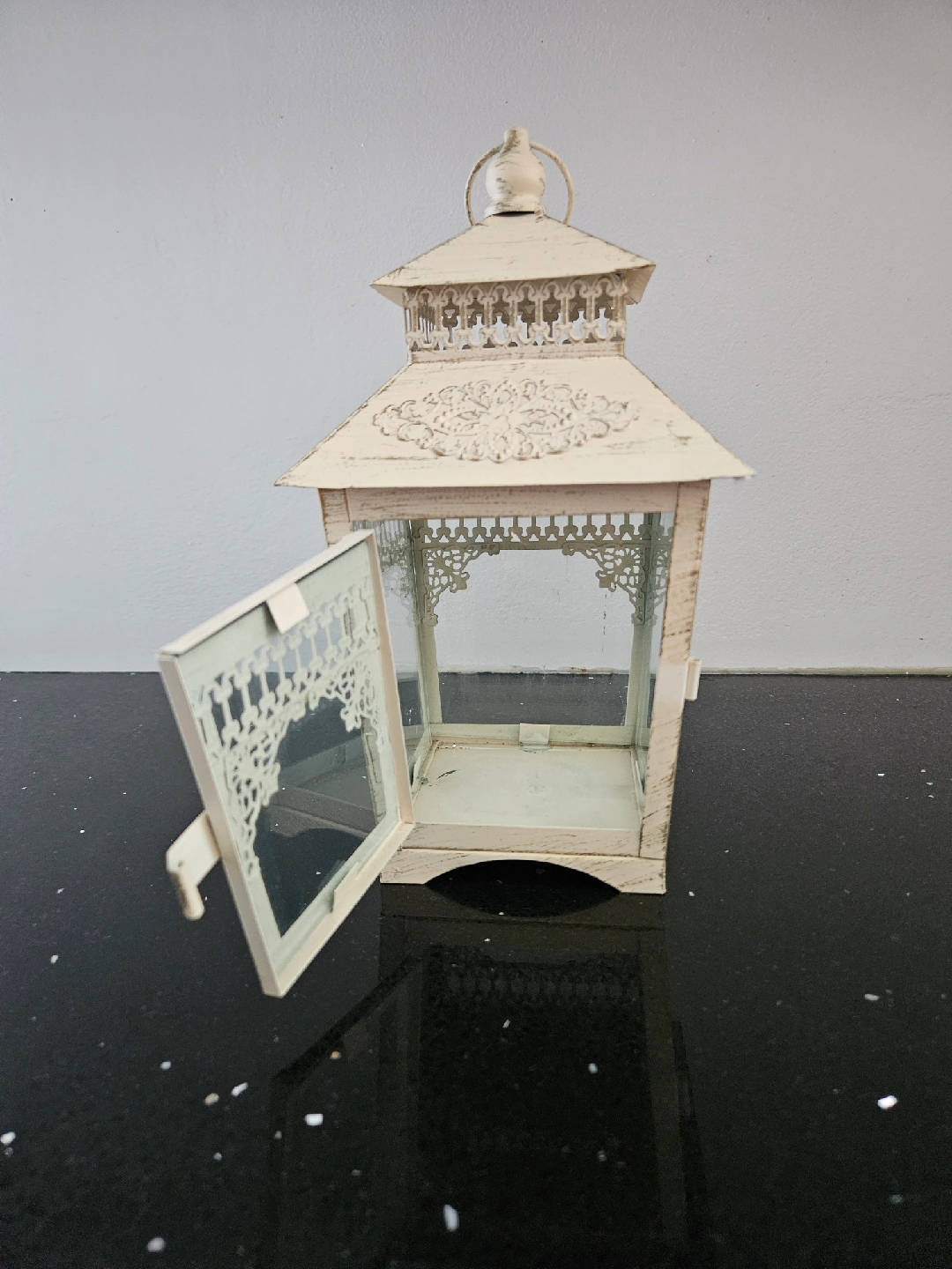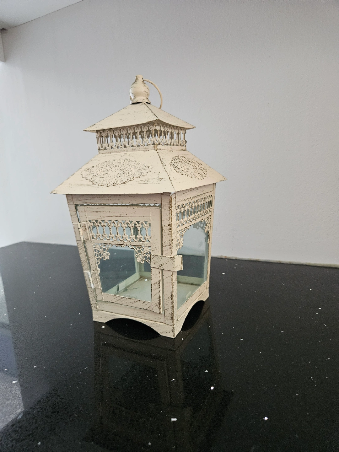•Used- Like New •10" H •Vintage style with a distressed finish •Hanging ring for easy hanging or sits on a flat surface •Can be used with small pillar candle, tea light or votive candle •Pick up Brampton - Kennedy & Vodden