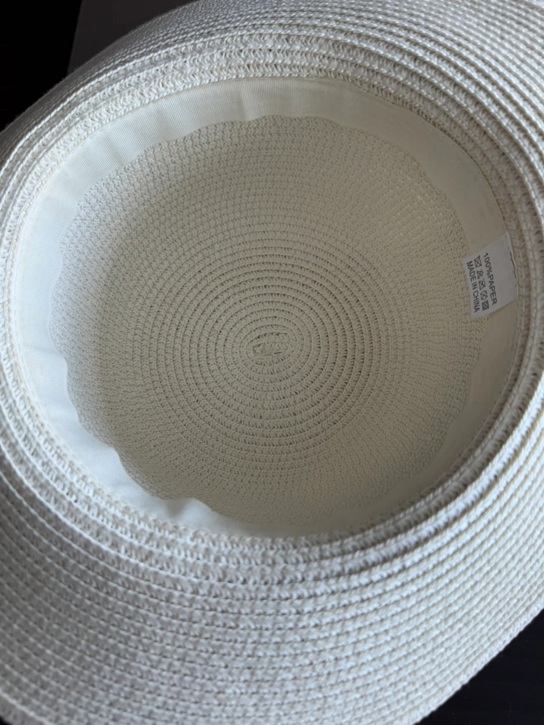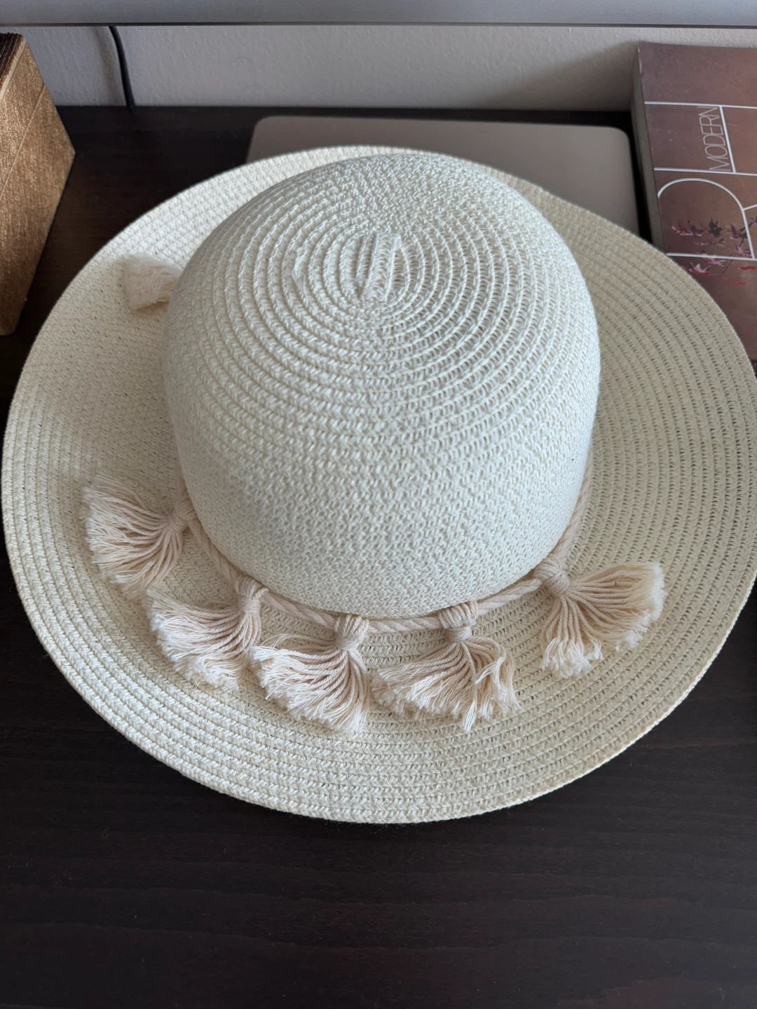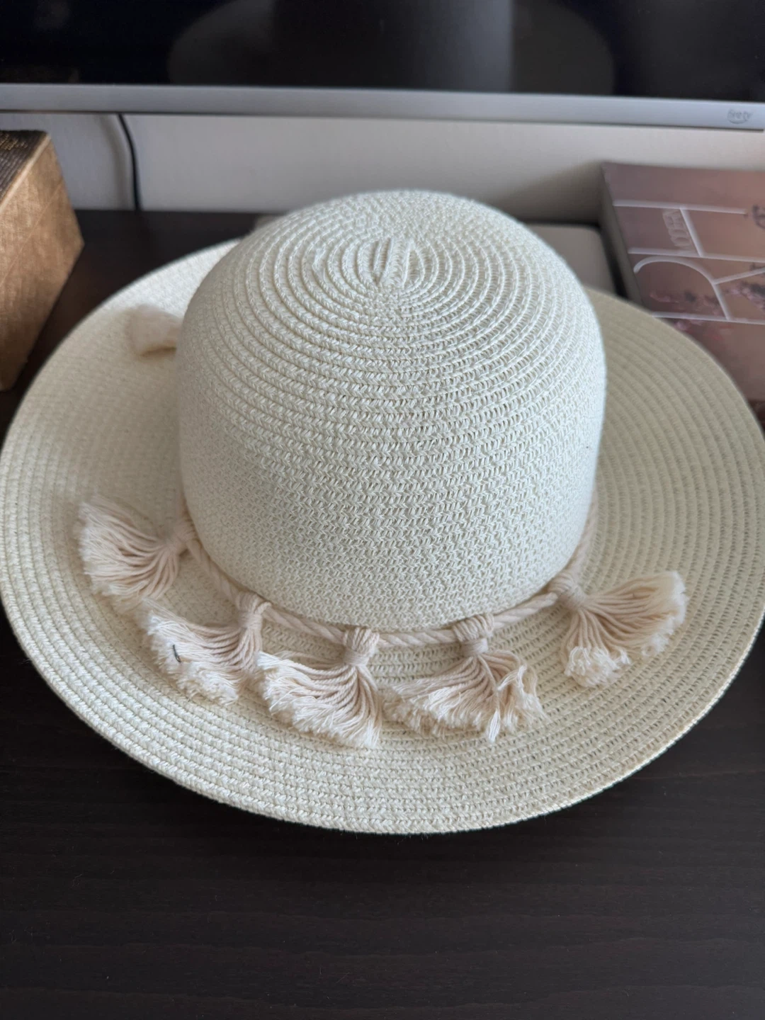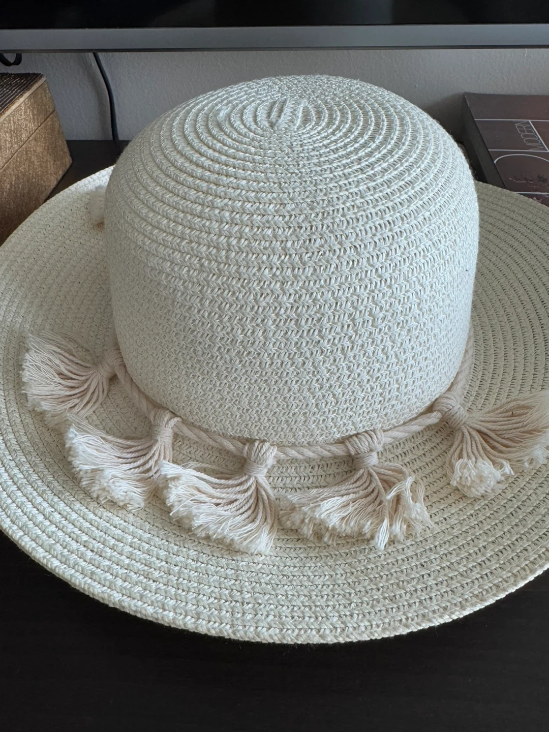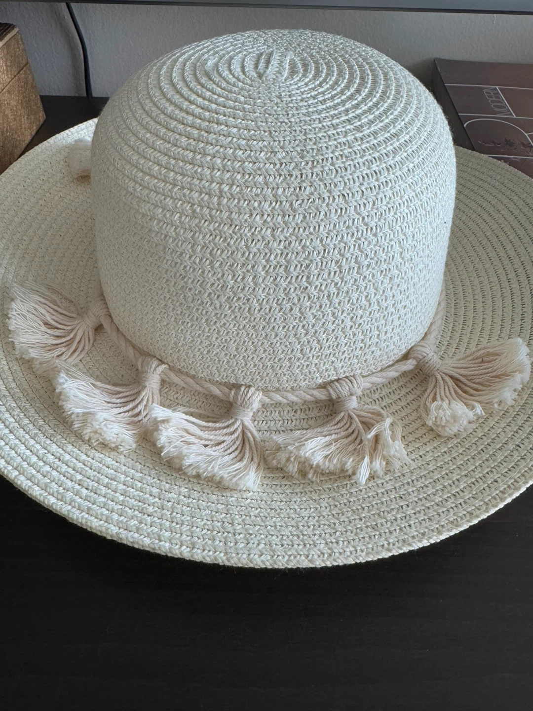 142Selling a lovely cream-coloured sun hat! It features a stylish design with tassels around the brim. The hat is made of 100% paper and is size 22.83". Perfect for sunny days!