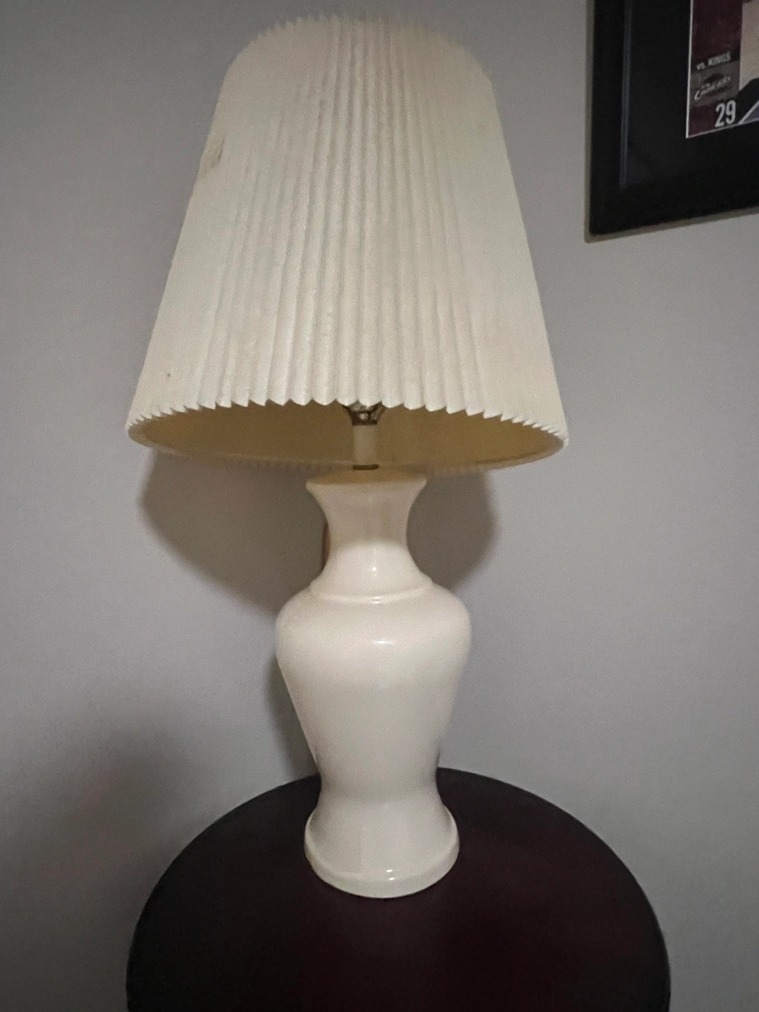60Elegant cream-coloured table lamp. Features a pleated fabric shade and a ceramic base. Perfect for a bedside table or end table. Needs new shade, otherwise perfect condition.