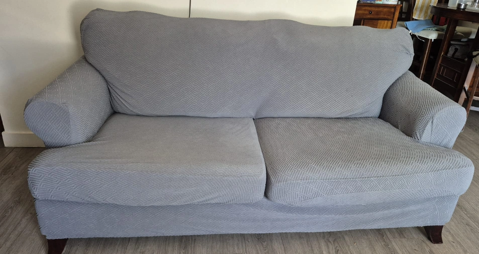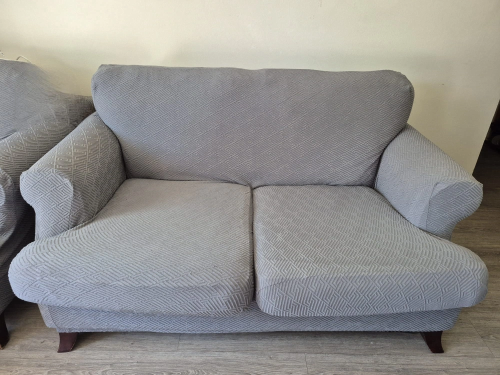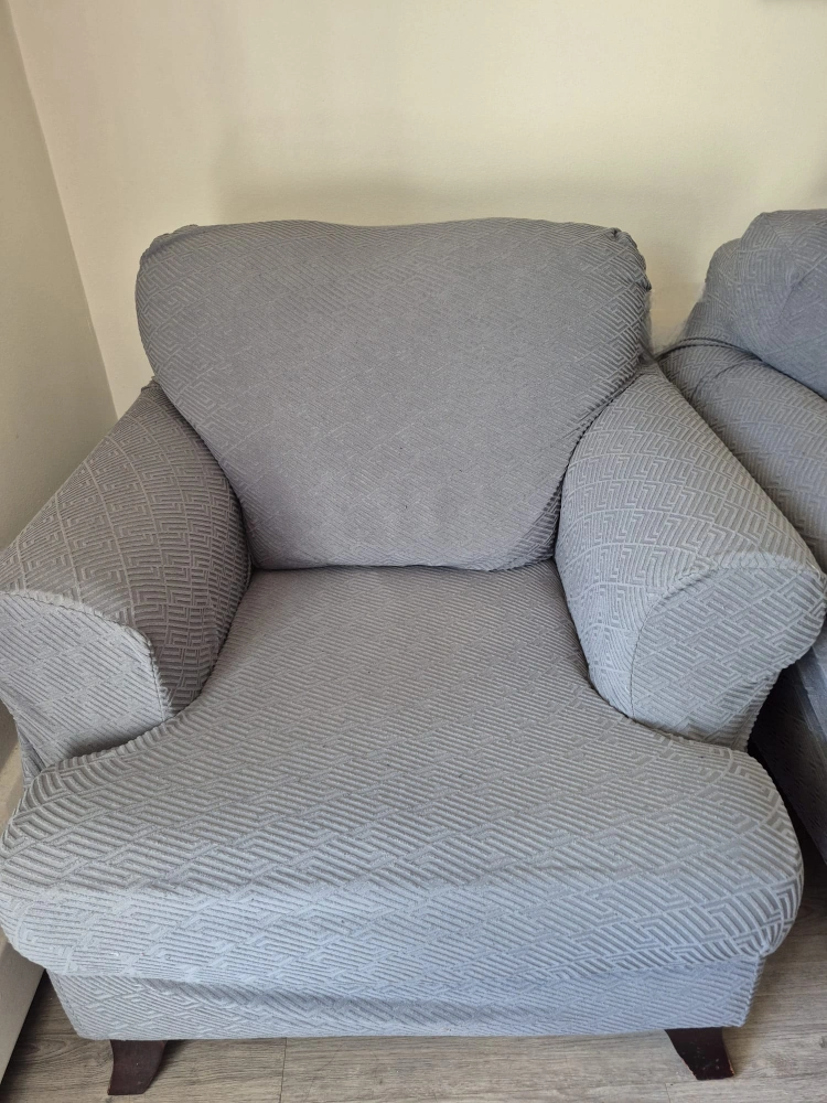 Selling a comfy sofa and armchair set. The set is in grey and would be great for a living room or den! They are covered with a patterned slipcover.3 seat,two seat and loveseat sofa.