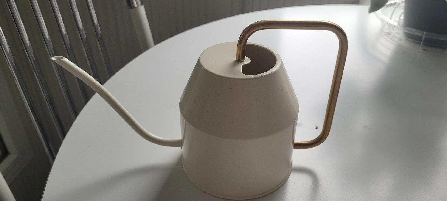 A cute cream-coloured watering can with a gold handle! Perfect for watering your indoor plants. There are some signs of use.
