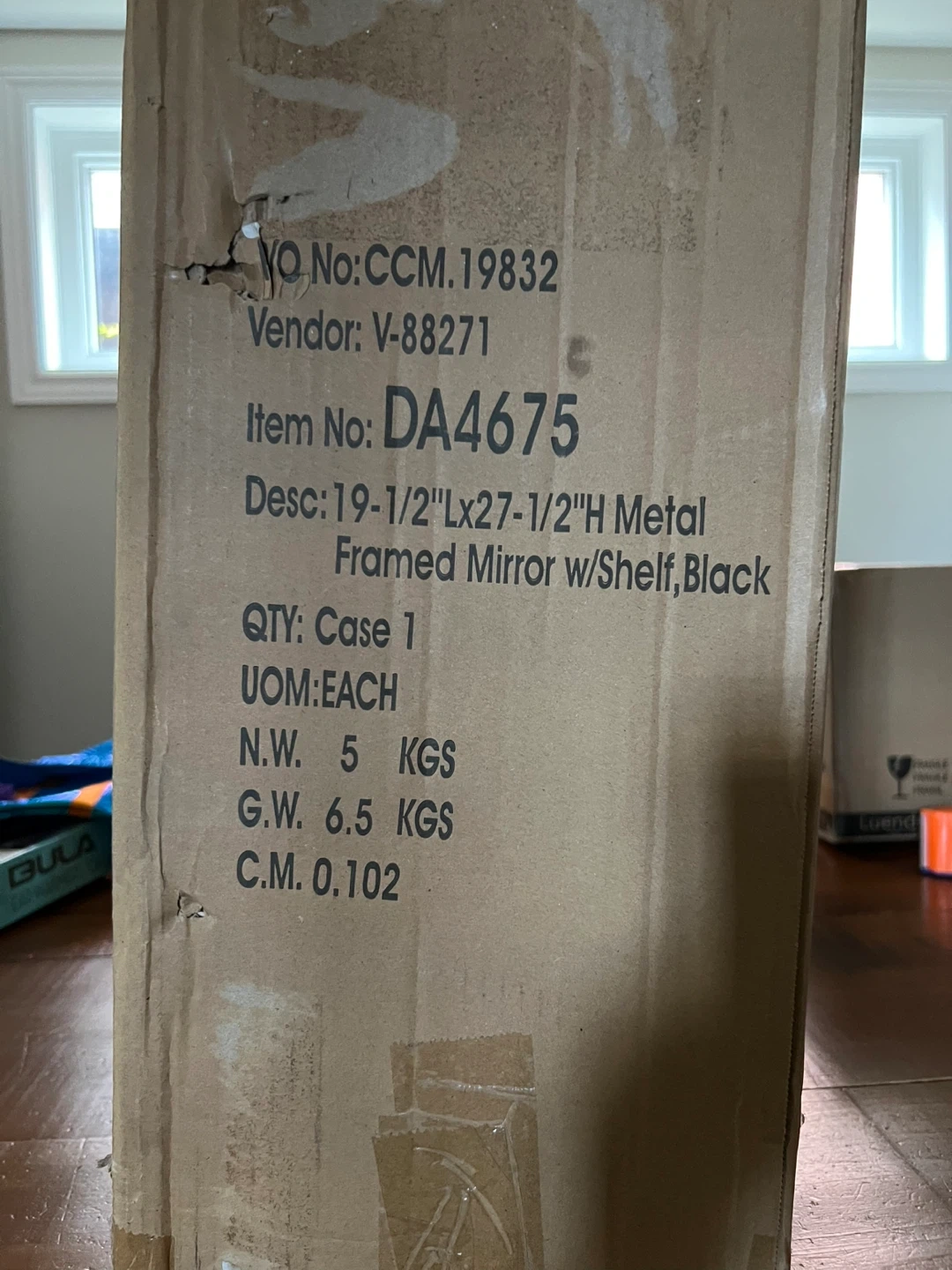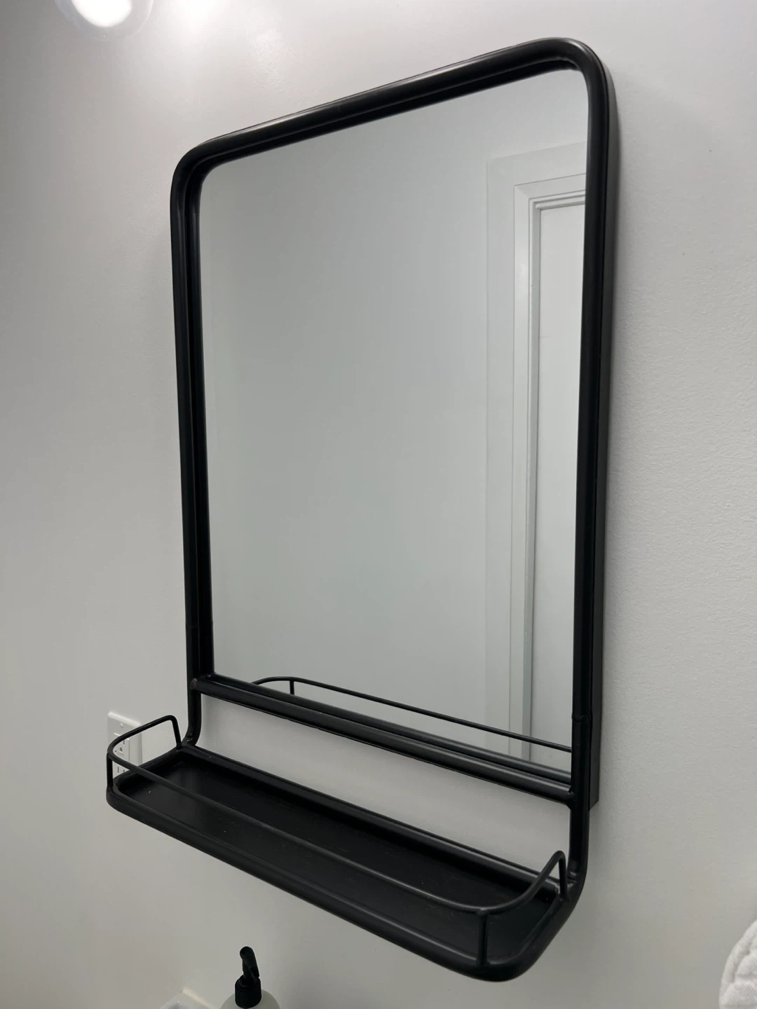 10Selling a brand new Creative Co-op metal framed mirror with a shelf! It's still in its original box. The mirror is black and measures approximately 19-1/2" L x 27-1/2" H. It's a stylish and functional piece for any bathroom or entryway