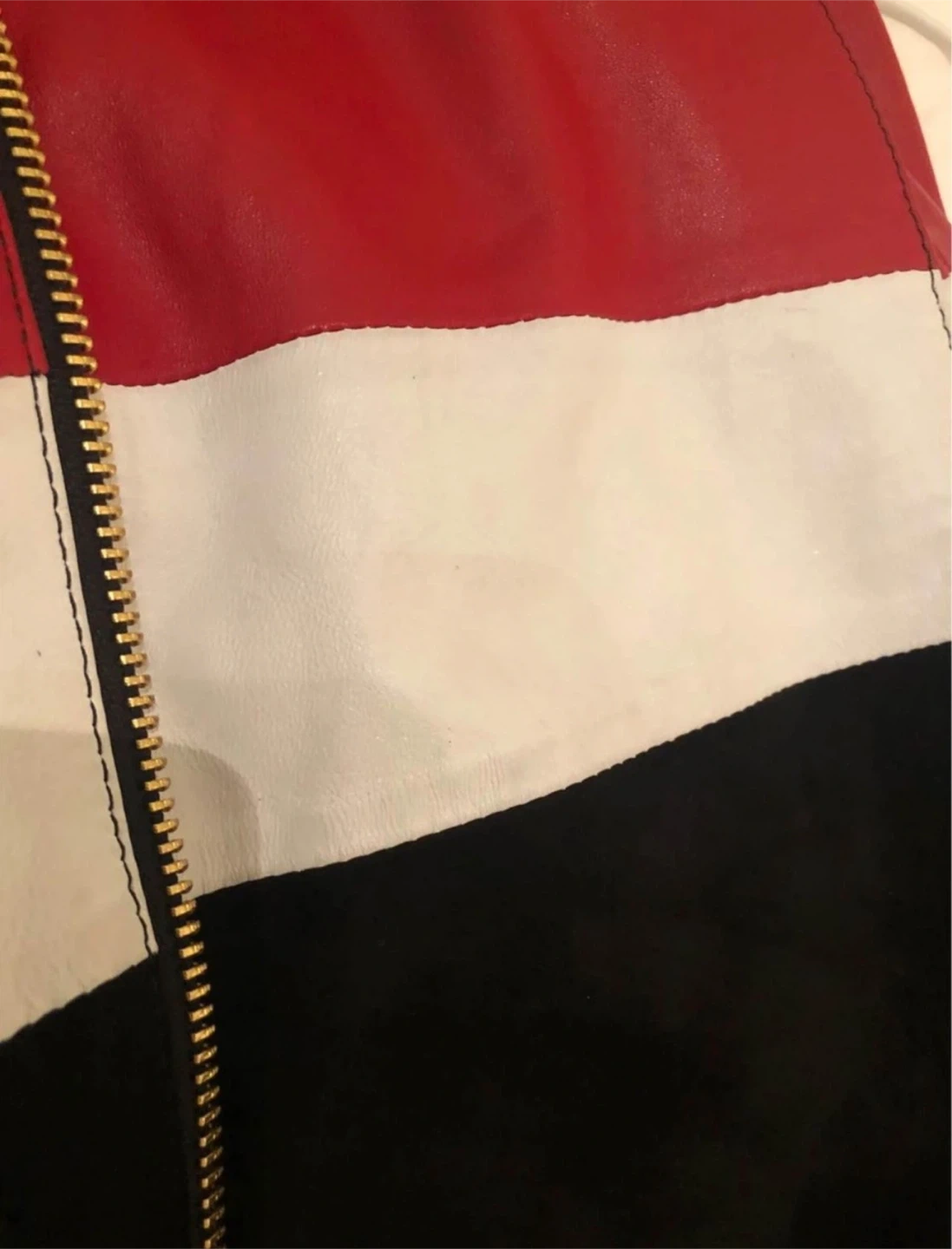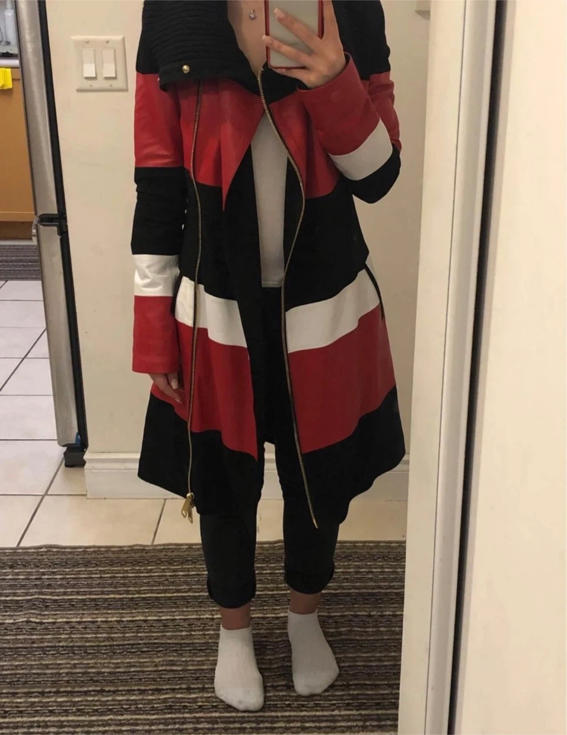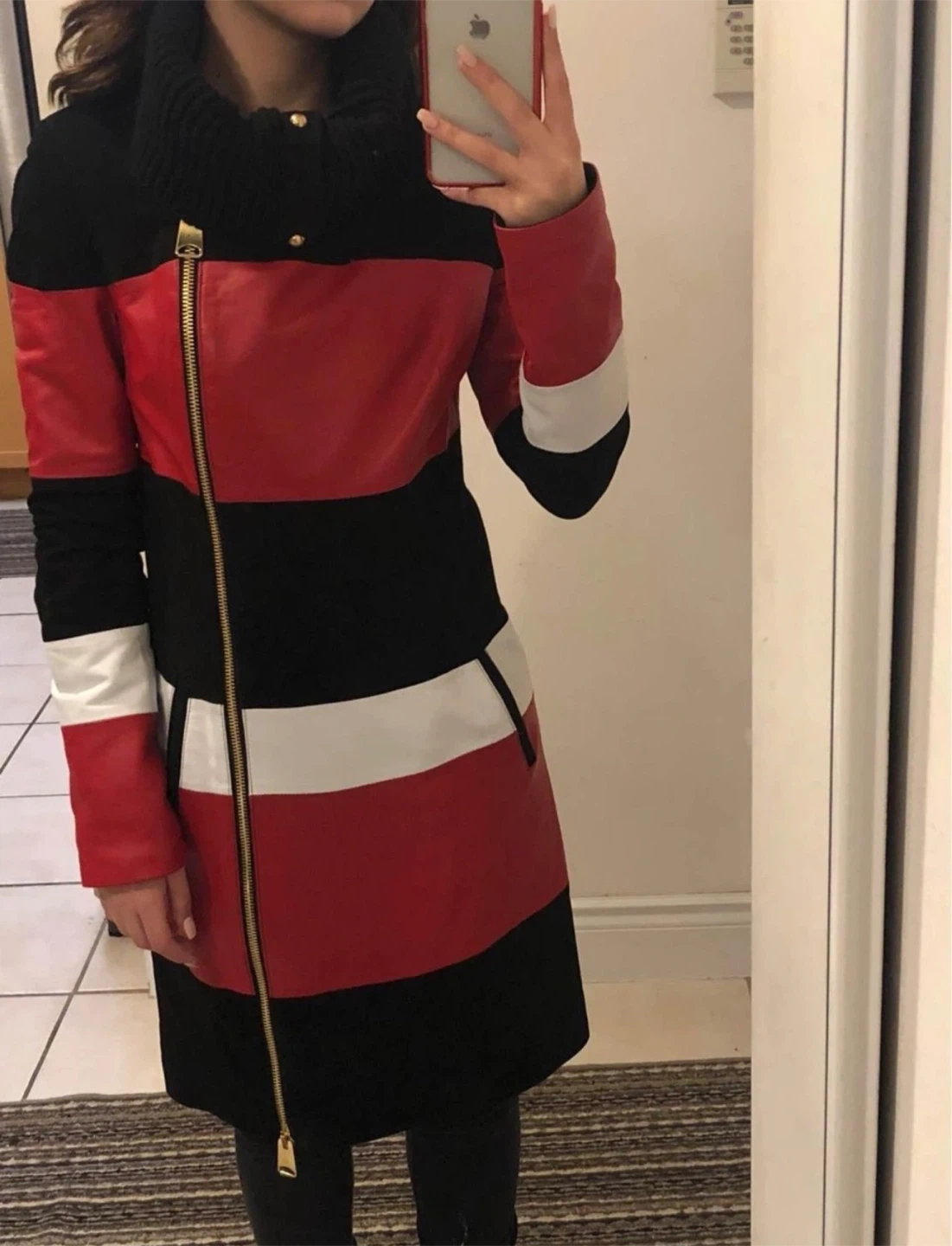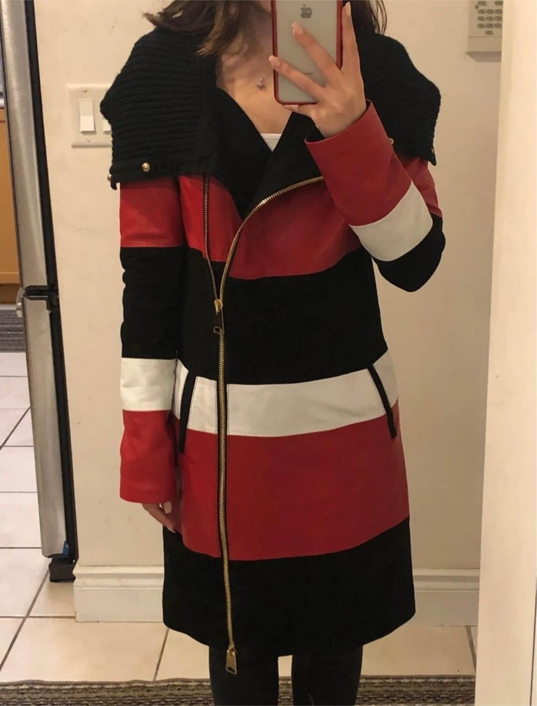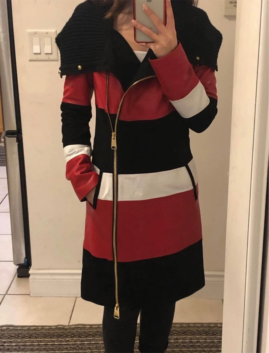 This stylish jacket features a unique colour block design with red, white, and black panels. It has a comfortable knit collar and a front zipper closure.