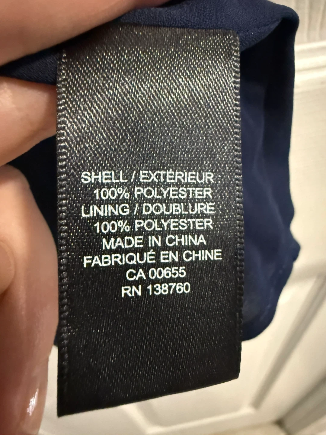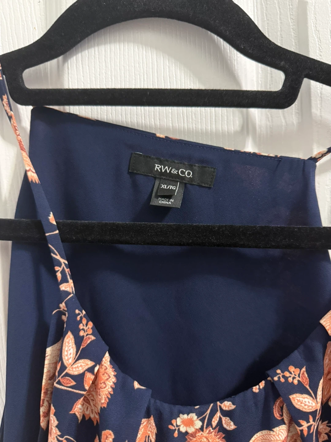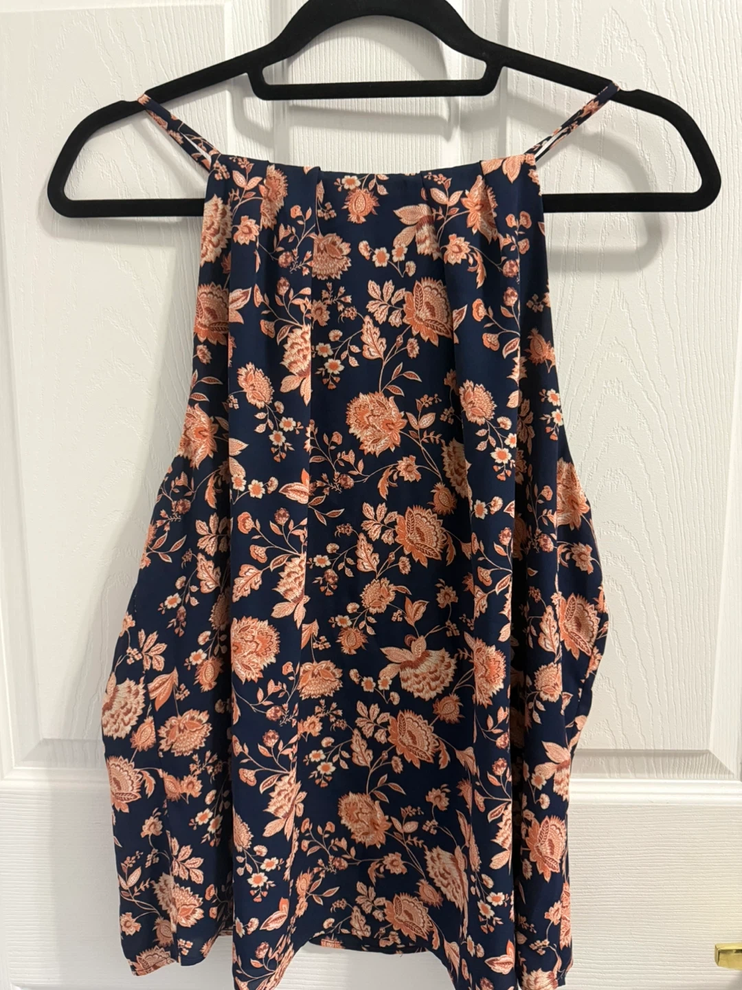 *Like new, only worn a couple of times* Navy blue sleeveless halter top with a floral print. Shell and lining are both 100% polyester. It's a size XL/TG.