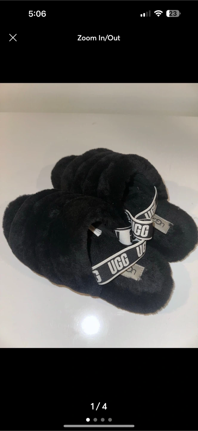 Selling a pair of UGG Fluff Yeah slides in black! They're super comfy and in great condition. Perfect for lounging around the house or running errands. The UGG logo is prominently displayed on the strap, adding a touch of style