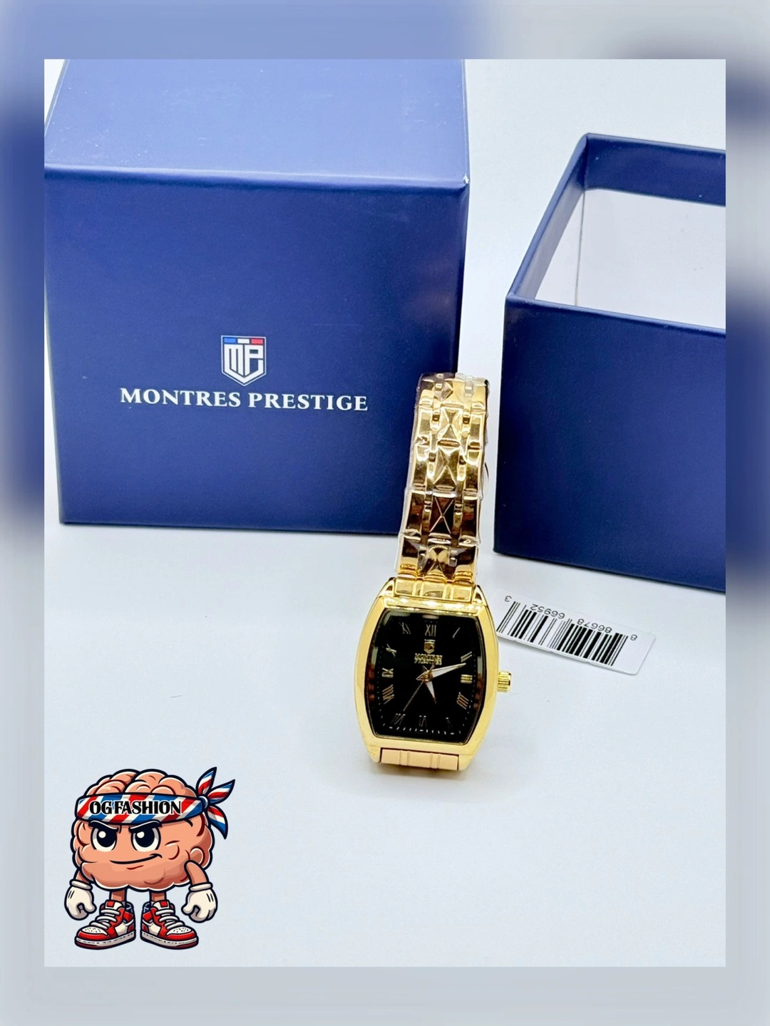 Brand new Montres Prestige gold watch with a sleek rectangular case.