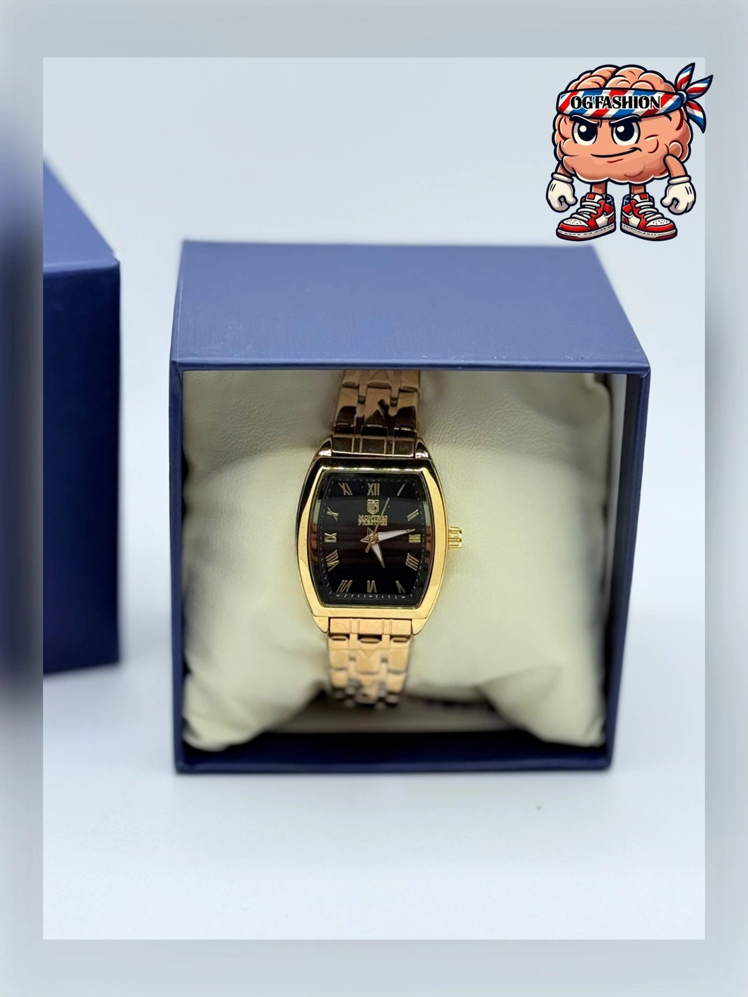 Elegant gold-tone bracelet and black dial with Roman numerals.