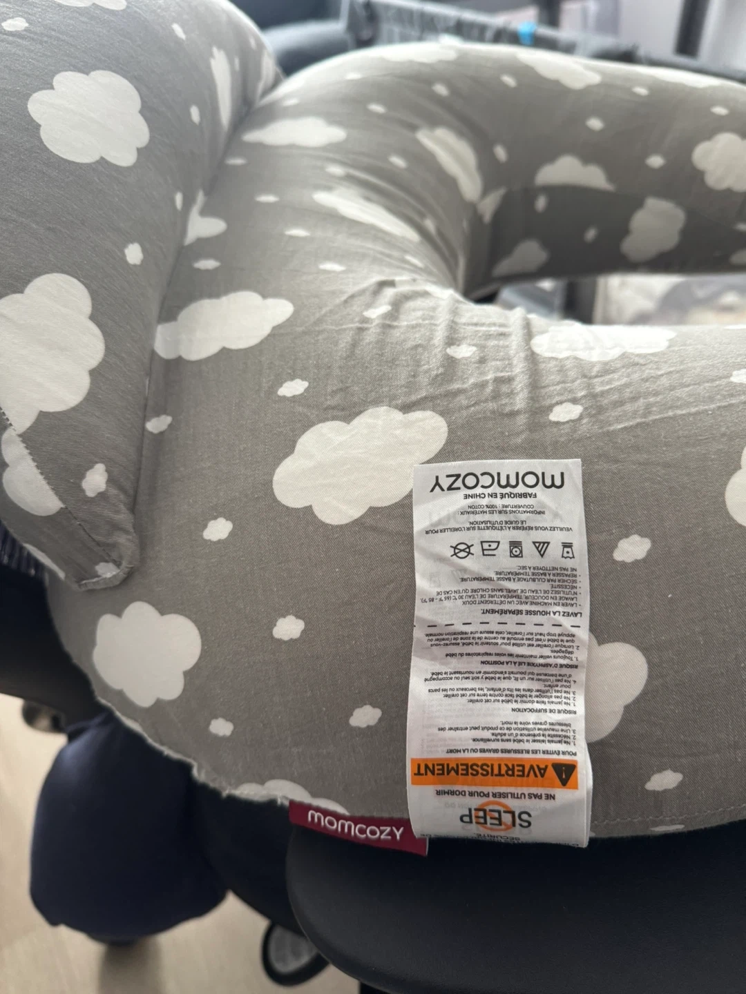 This Momcozy nursing pillow is designed for comfort. It features a grey fabric with a white cloud pattern. The pillow is U-shaped, perfect for supporting you and your baby during feeding. It's made with a soft cover for easy care.
