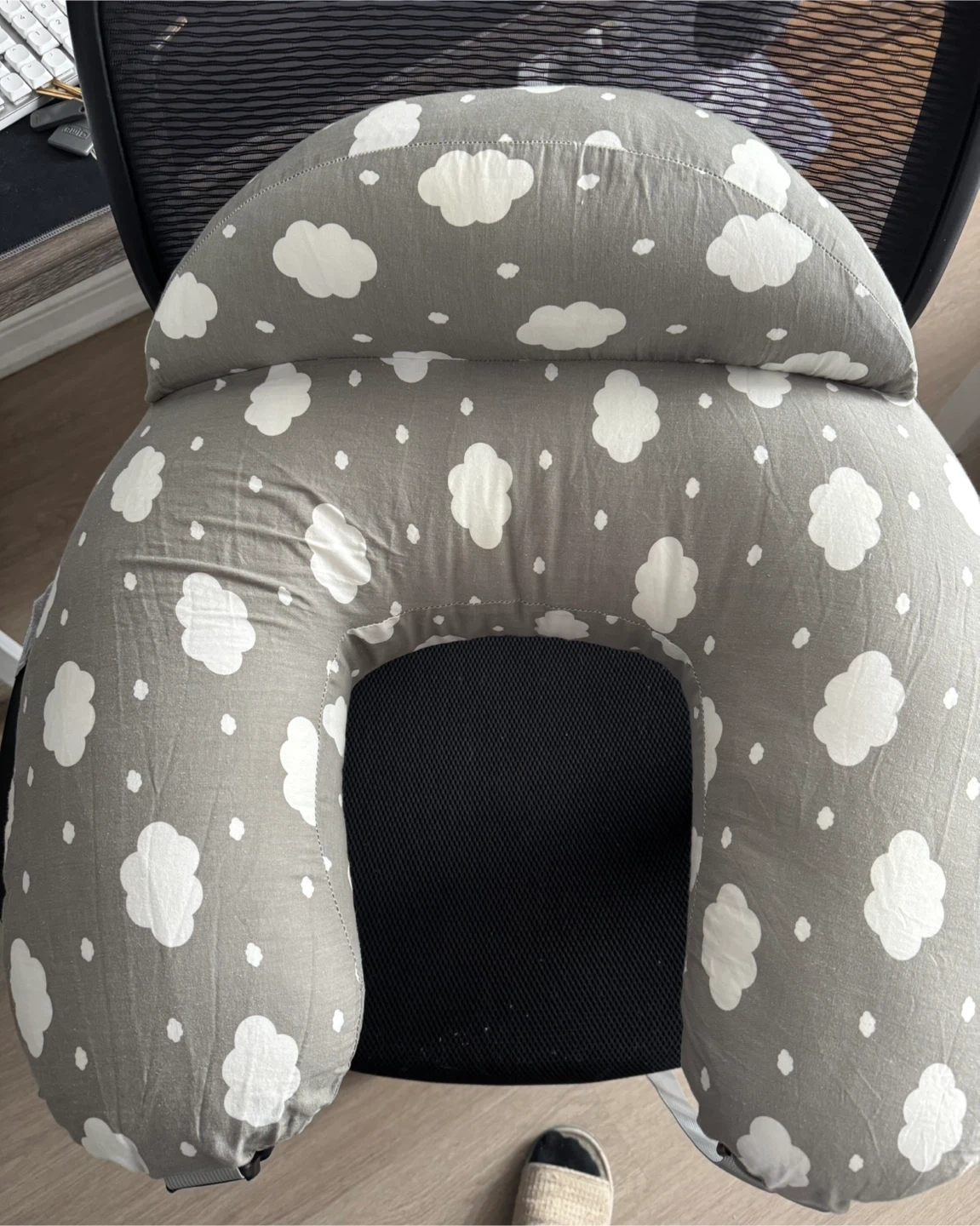 This Momcozy nursing pillow is designed for comfort. It features a grey fabric with a white cloud pattern. The pillow is U-shaped, perfect for supporting you and your baby during feeding. It's made with a soft cover for easy care.