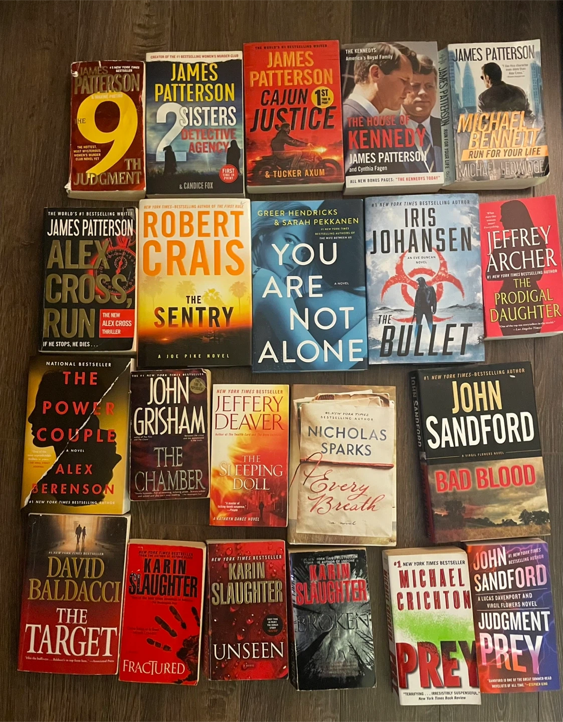 This lot includes 22 popular mystery and thriller novels by authors like James Patterson, Robert Crais, Karin Slaughter, and John Grisham. Titles span various series and standalone stories. Books are in good condition.
