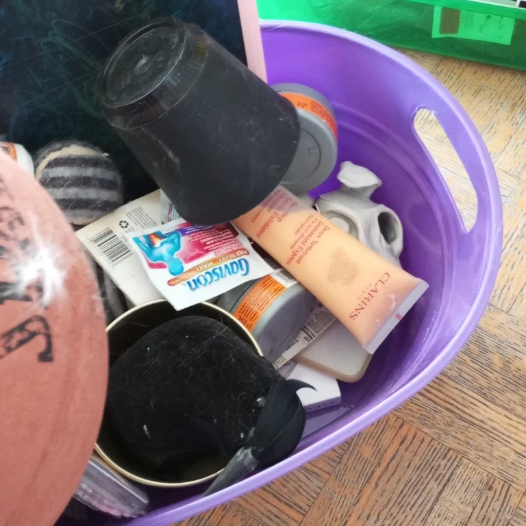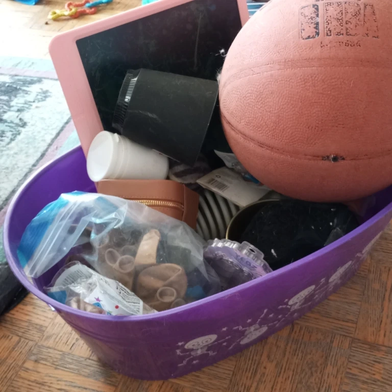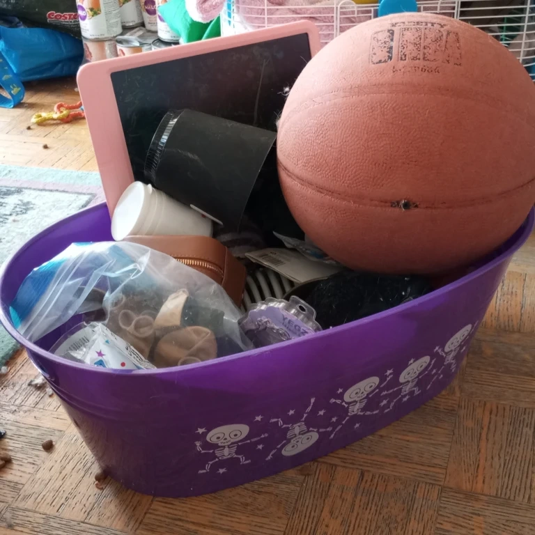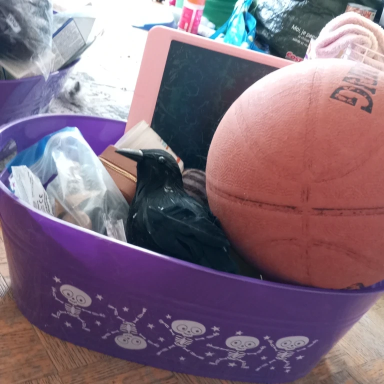 This purple Halloween-themed bin's filled with various items including a basketball, a decorative crow, and some personal care products. It's a fun mix of decorations and useful items all in one container. Great for a Halloween party or as a unique gift!