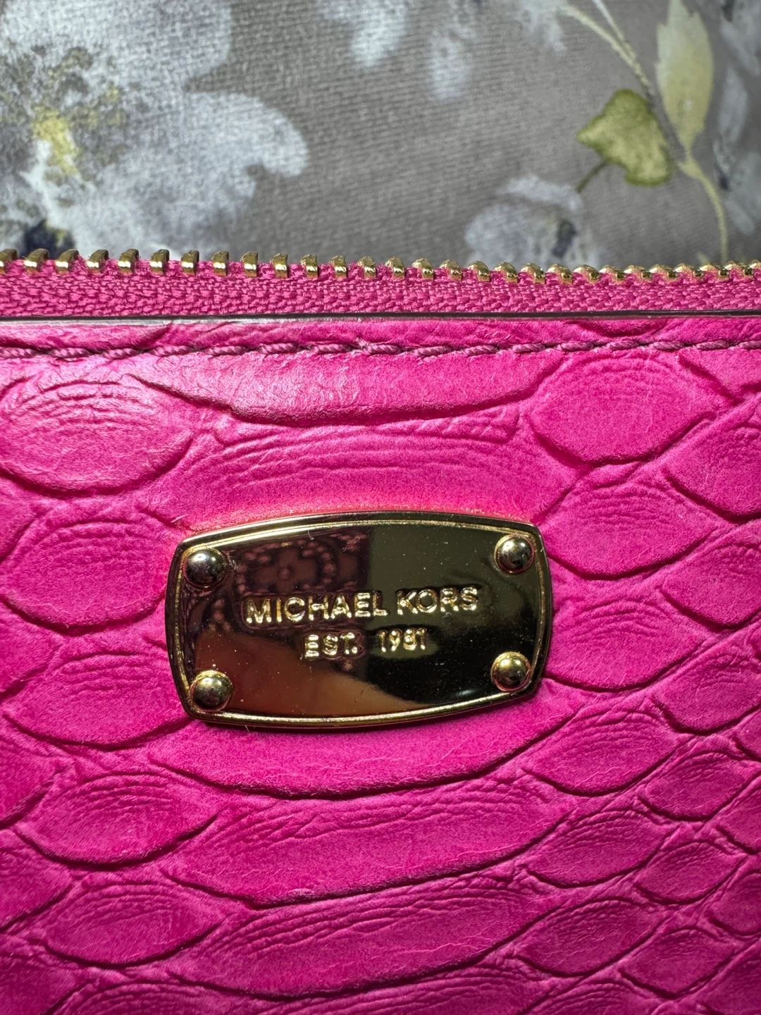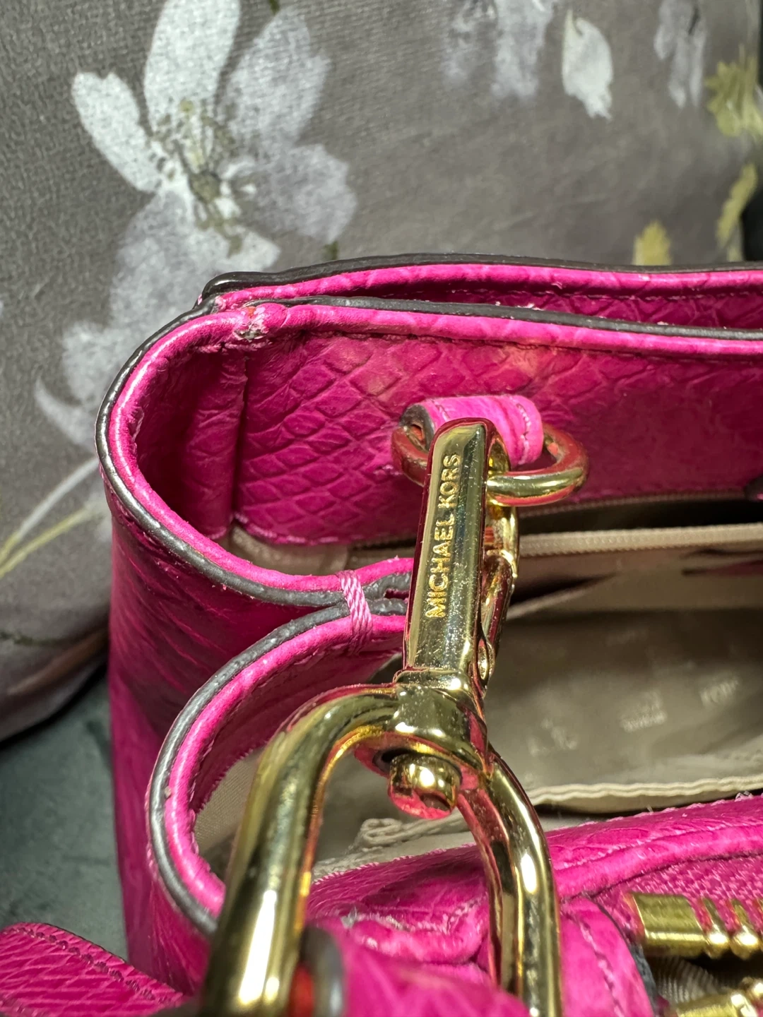 Selling a cute Michael Kors satchel bag in a vibrant pink color. It features a textured exterior and gold-tone hardware. The interior lining has the Michael Kors logo pattern. Great for adding a pop of color to your outfit!