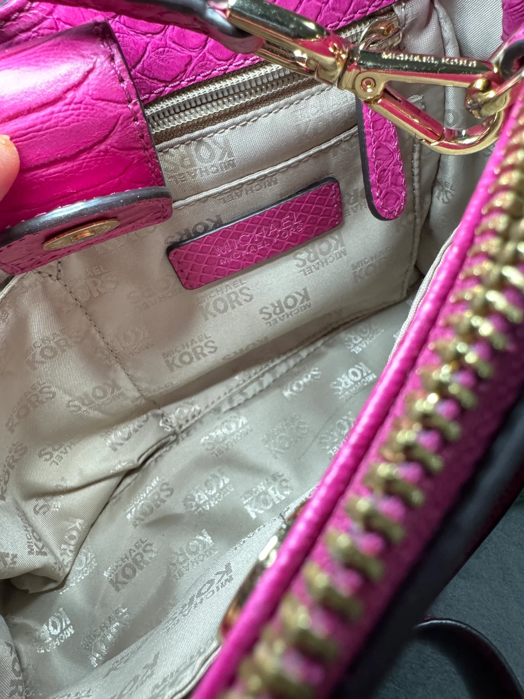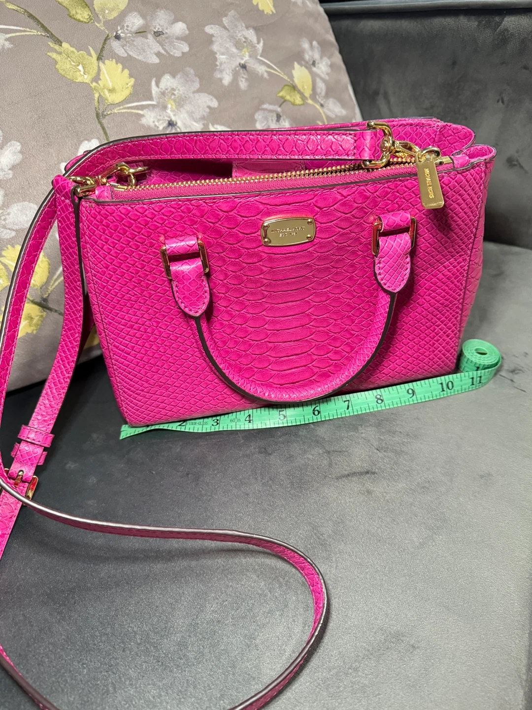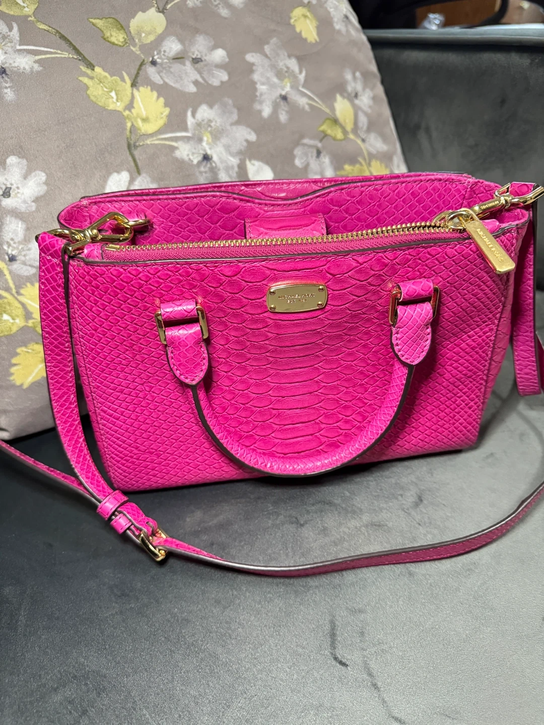 Selling a cute Michael Kors satchel bag in a vibrant pink color. It features a textured exterior and gold-tone hardware. The interior lining has the Michael Kors logo pattern. Great for adding a pop of color to your outfit!