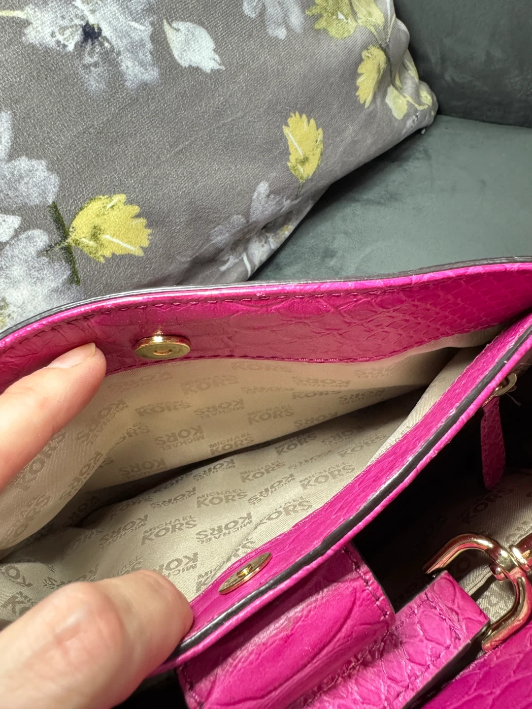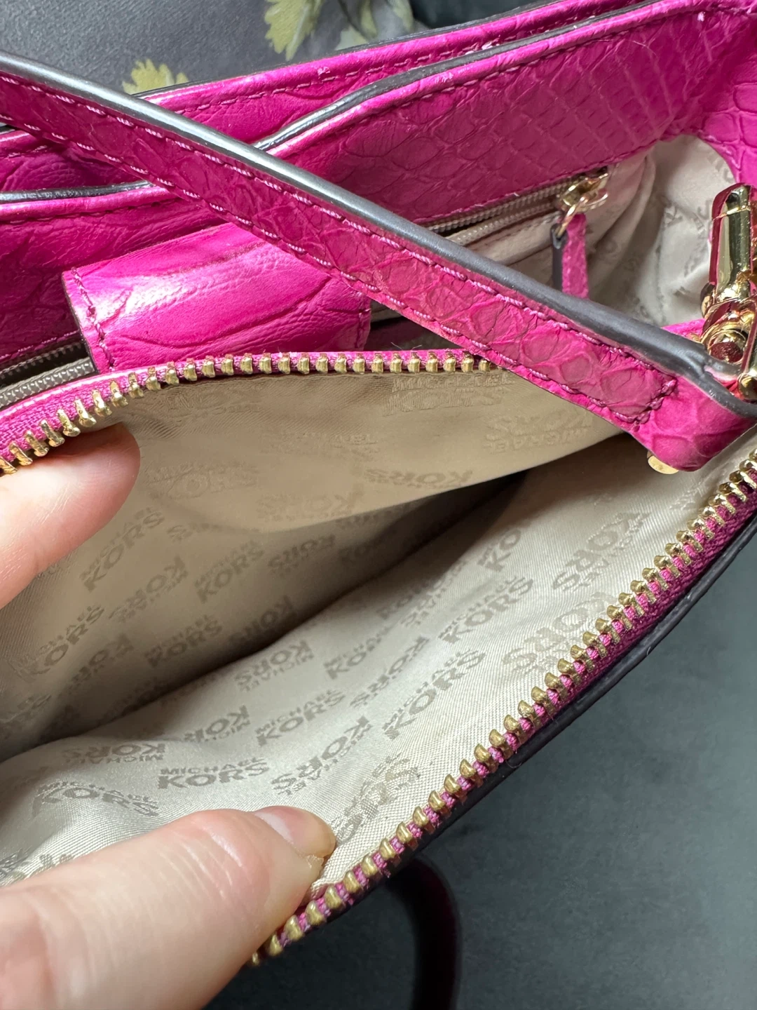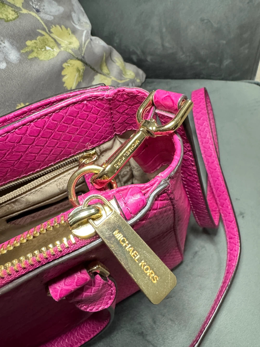 Selling a cute Michael Kors satchel bag in a vibrant pink color. It features a textured exterior and gold-tone hardware. The interior lining has the Michael Kors logo pattern. Great for adding a pop of color to your outfit!