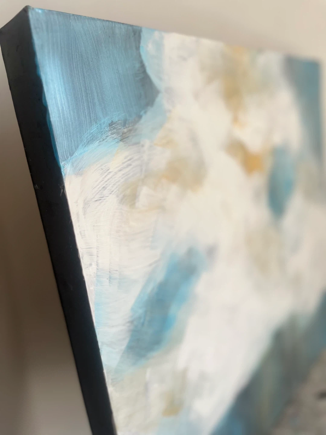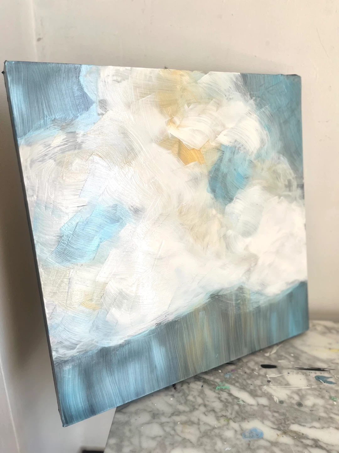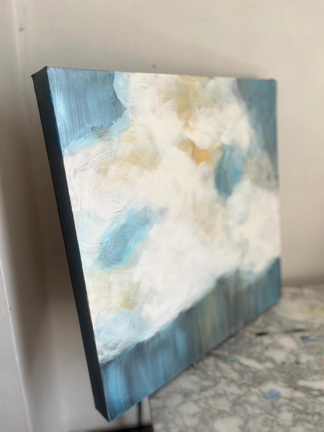 Hand painted Abstract painting featuring soft, blended colours reminiscent of clouds. It's on a canvas with painted edges. Perfect for adding a serene touch to any room!