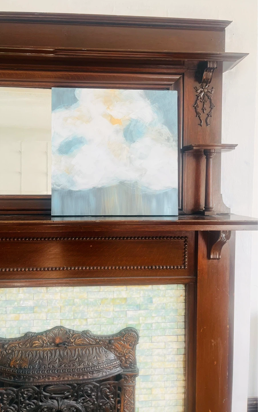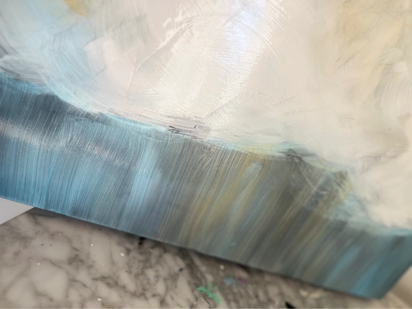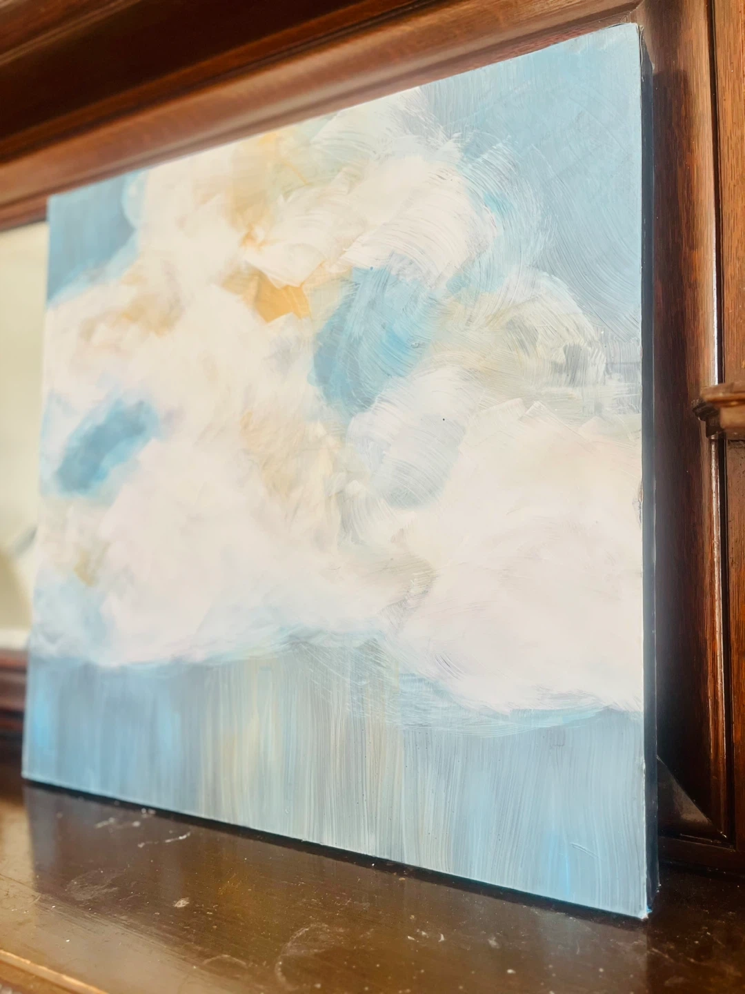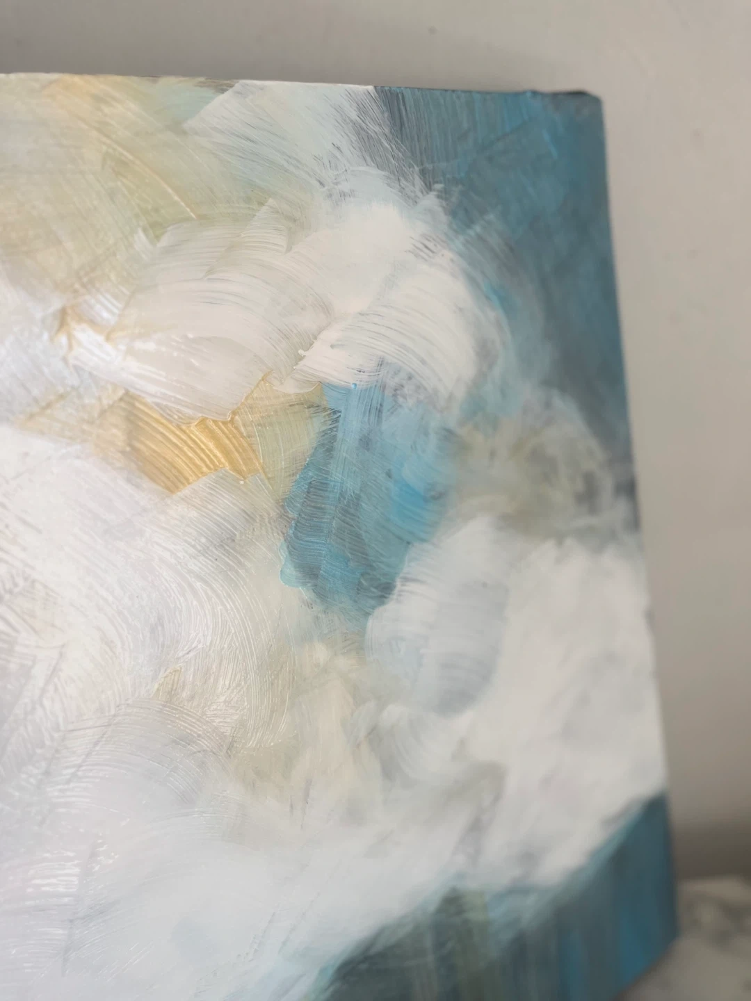 Hand painted Abstract painting featuring soft, blended colours reminiscent of clouds. It's on a canvas with painted edges. Perfect for adding a serene touch to any room!