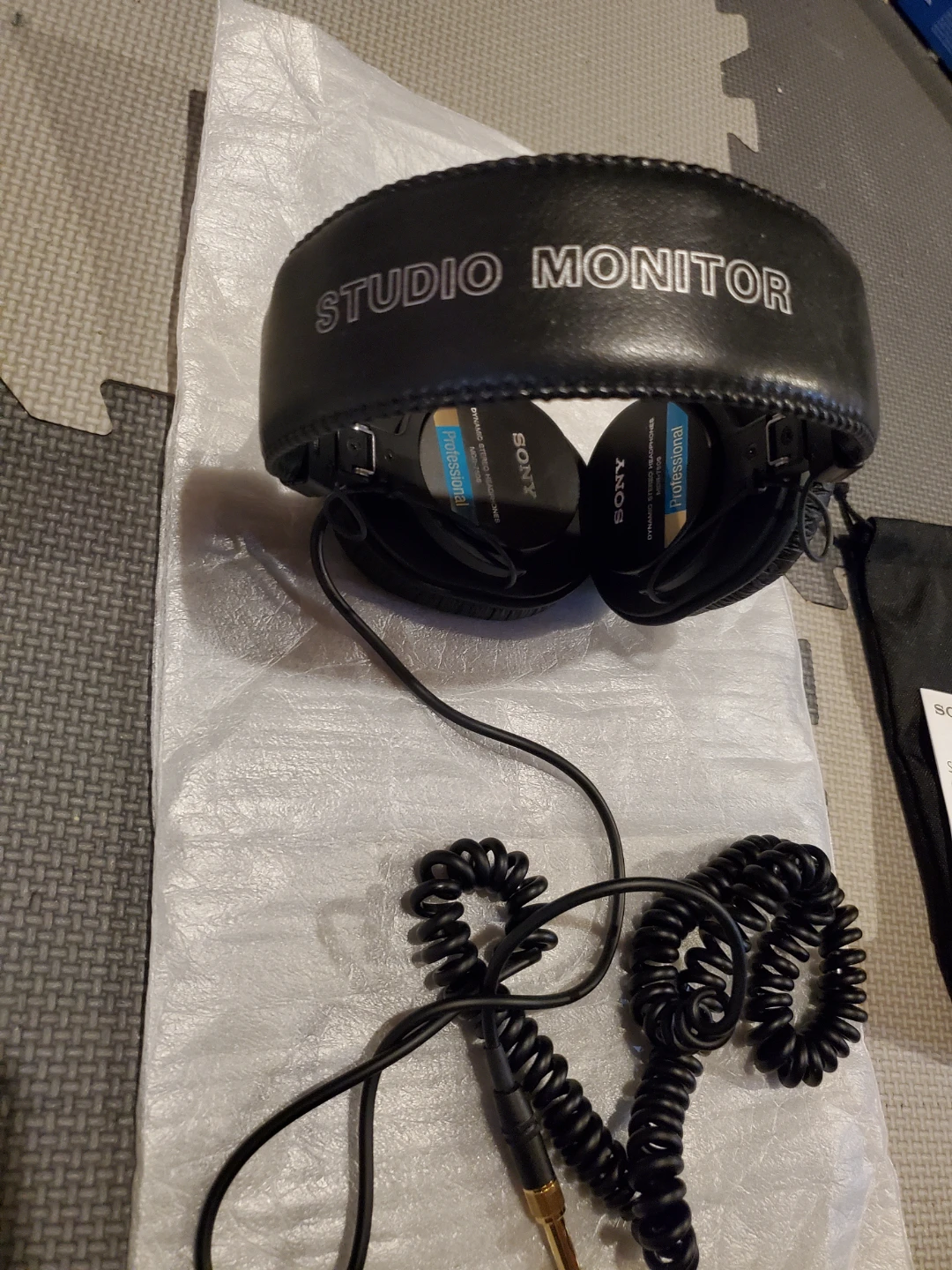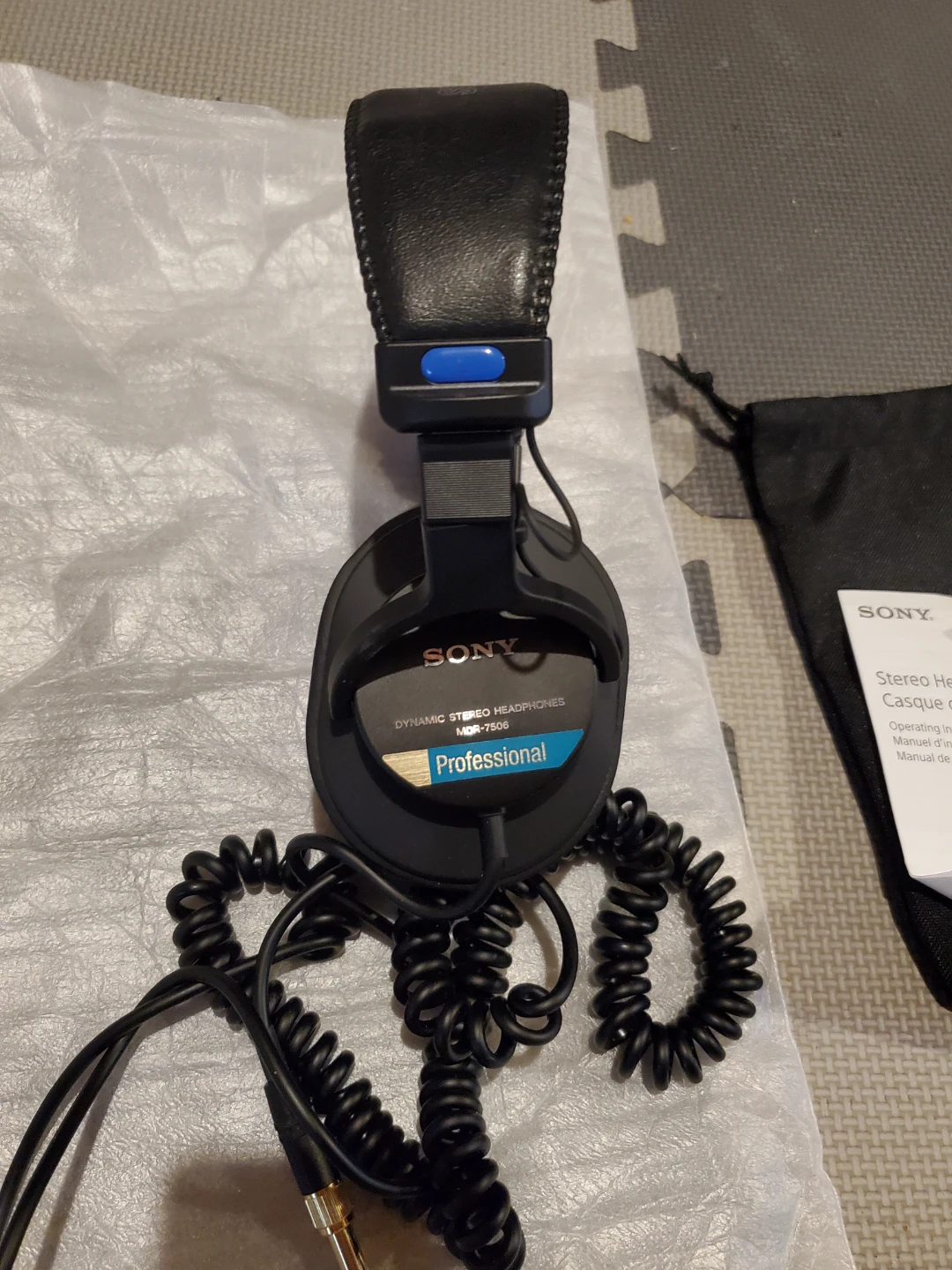 Sony MDR-7506 dynamic stereo headphones. Professional model with a coiled cable and gold-plated adapter included. These headphones are black.
