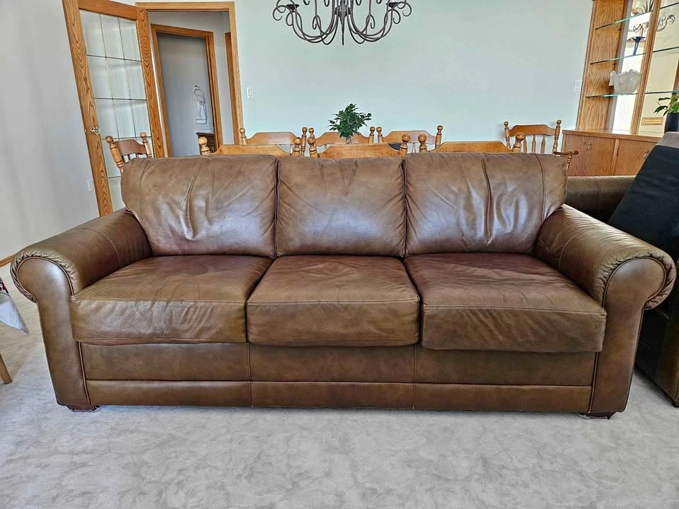 Beautiful brown genuine leather 3-seater sofa purchased from Costco. This couch is extremely comfortable with deep seating and supportive cushions, perfect for everyday use or relaxing nights in.