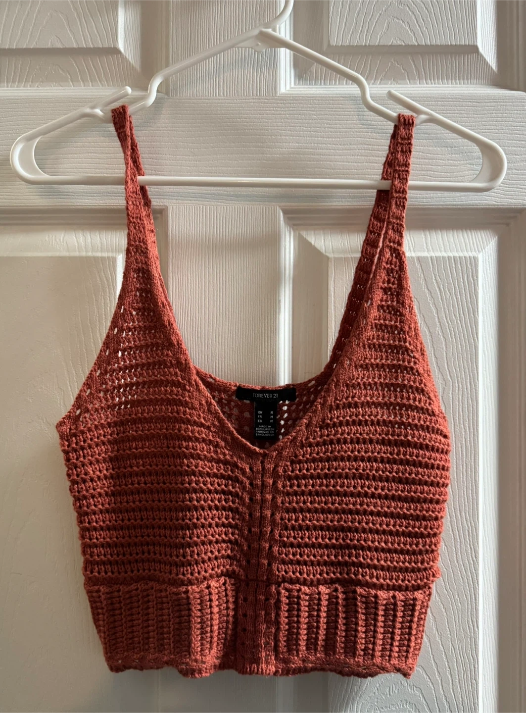 71Selling a cute Forever 21 crochet tank top in size medium! It's a lovely rust colour and has a V-neck design. Perfect for summer!
