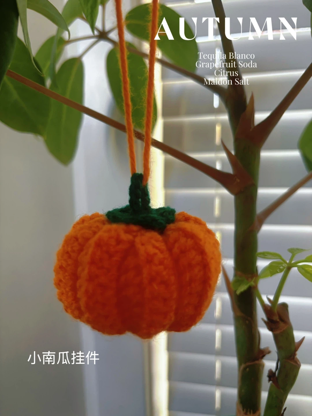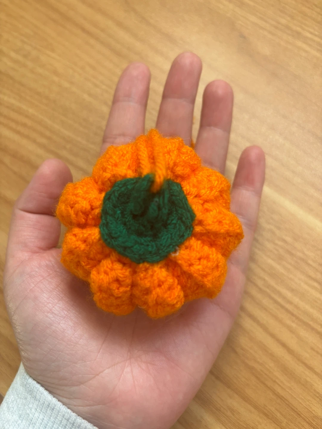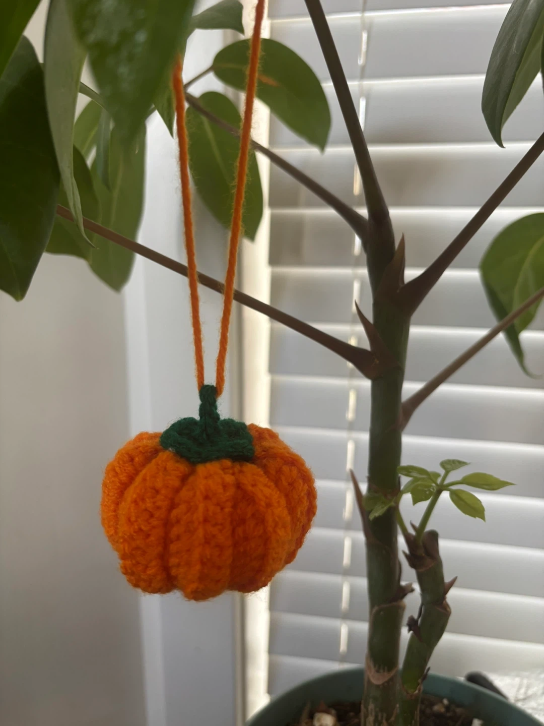 A cute, handmade crocheted pumpkin ornament, perfect for adding a touch of autumn to your home! It's a lovely orange colour with a green stem.