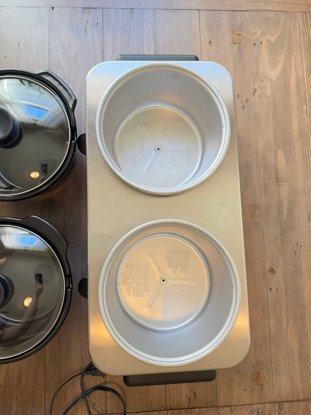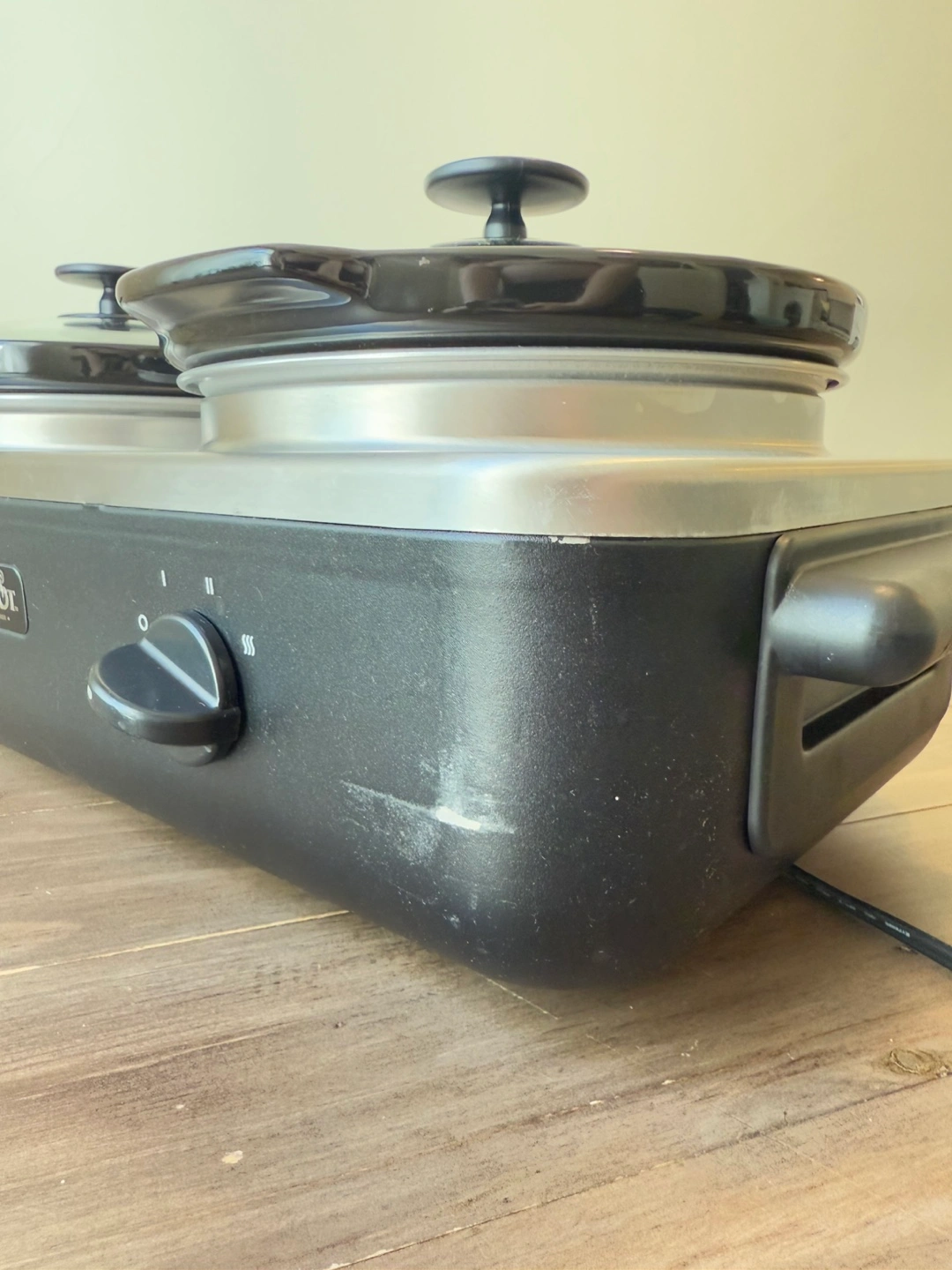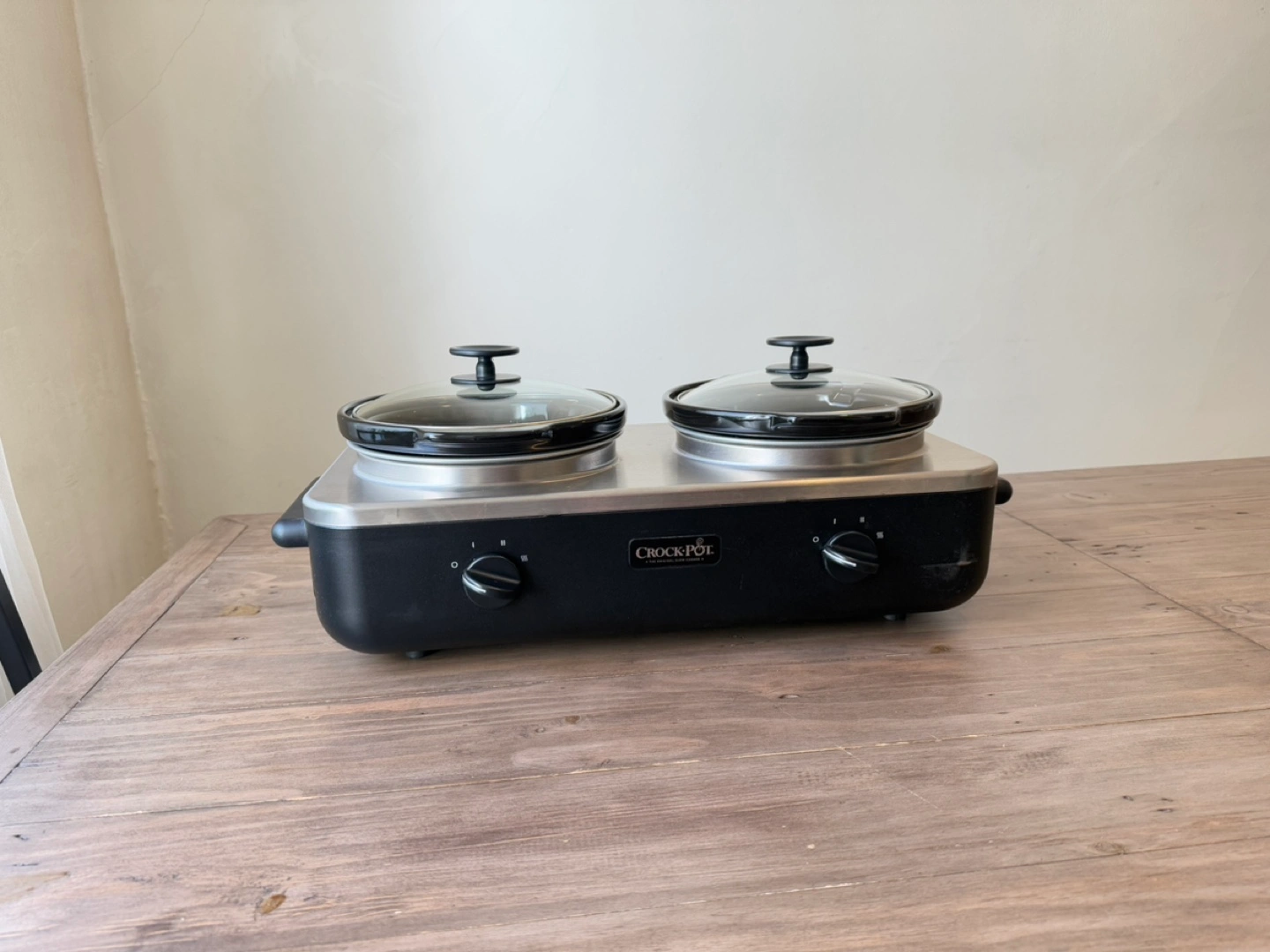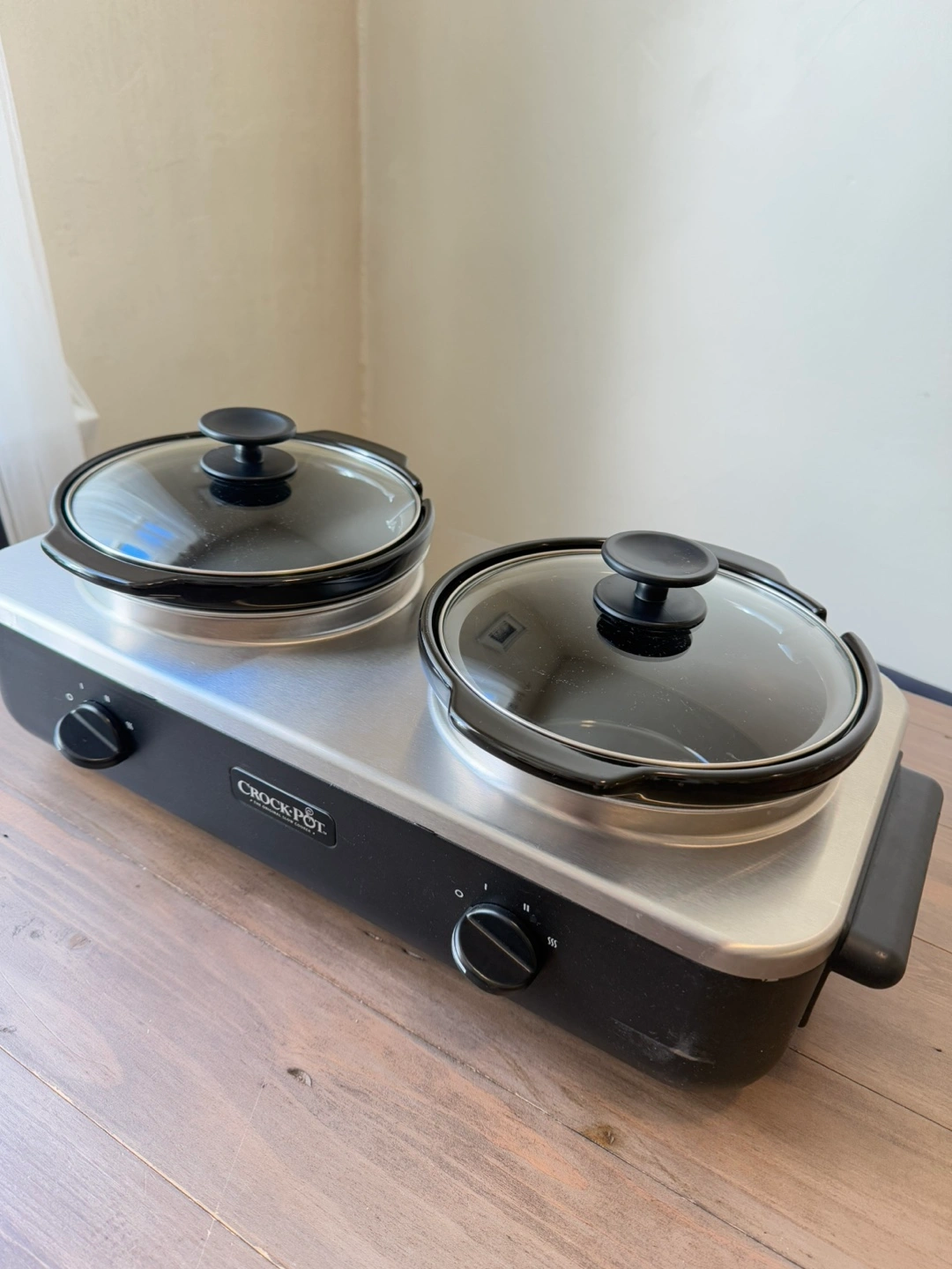 Official Crockpot™ brand slow cooker; only damage is a scratch on the right front corner (see photo). In perfect working condition; I just never reach for this anymore. Each pot comes with a glass lid and holds about 2 ¼ litres. Whole setup measures 22.5in long, 11in wide, 9in tall. Excellent for parties or large gatherings.