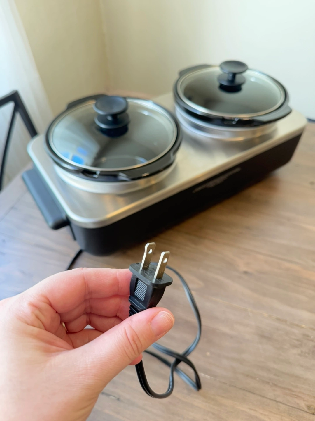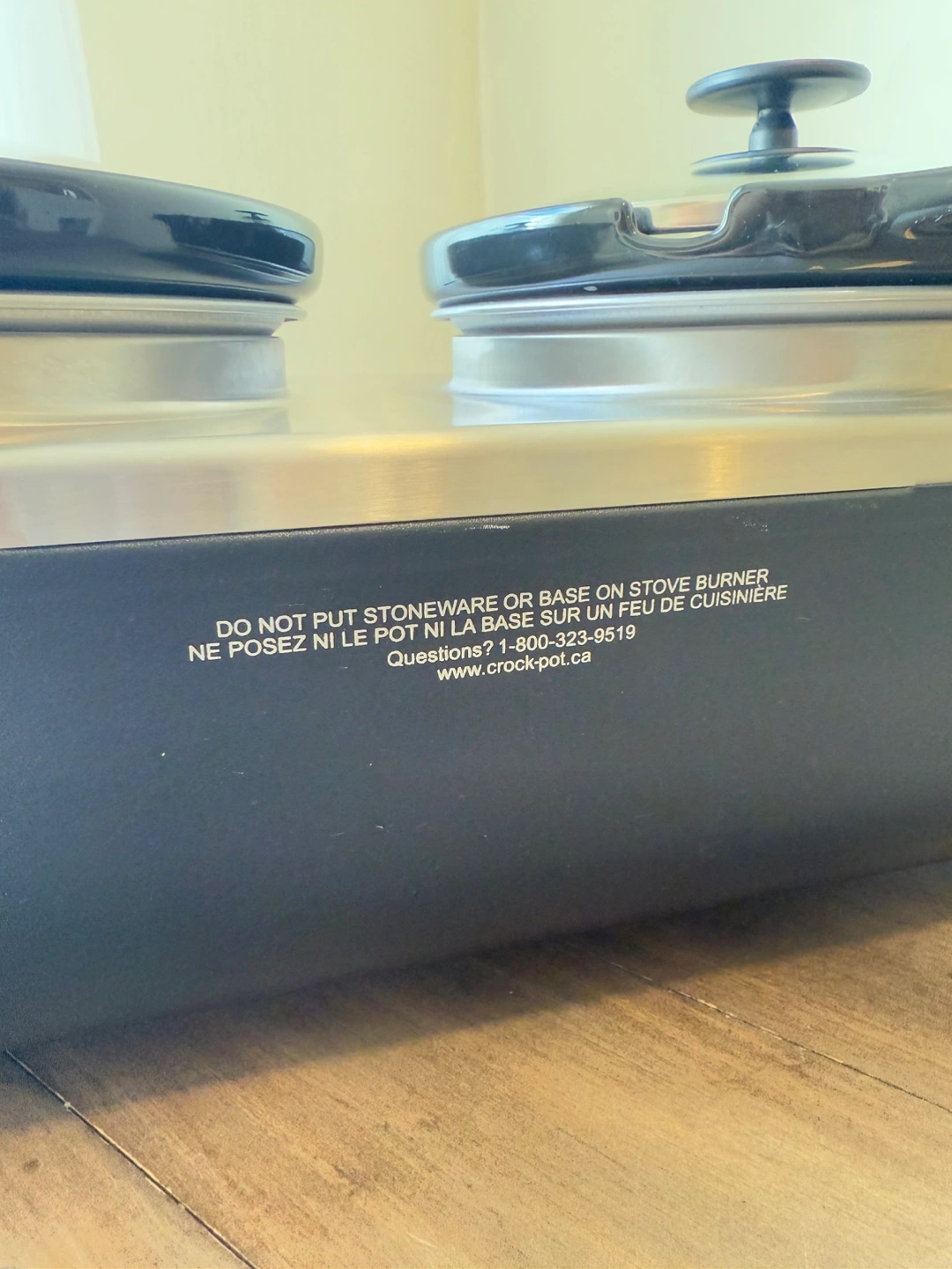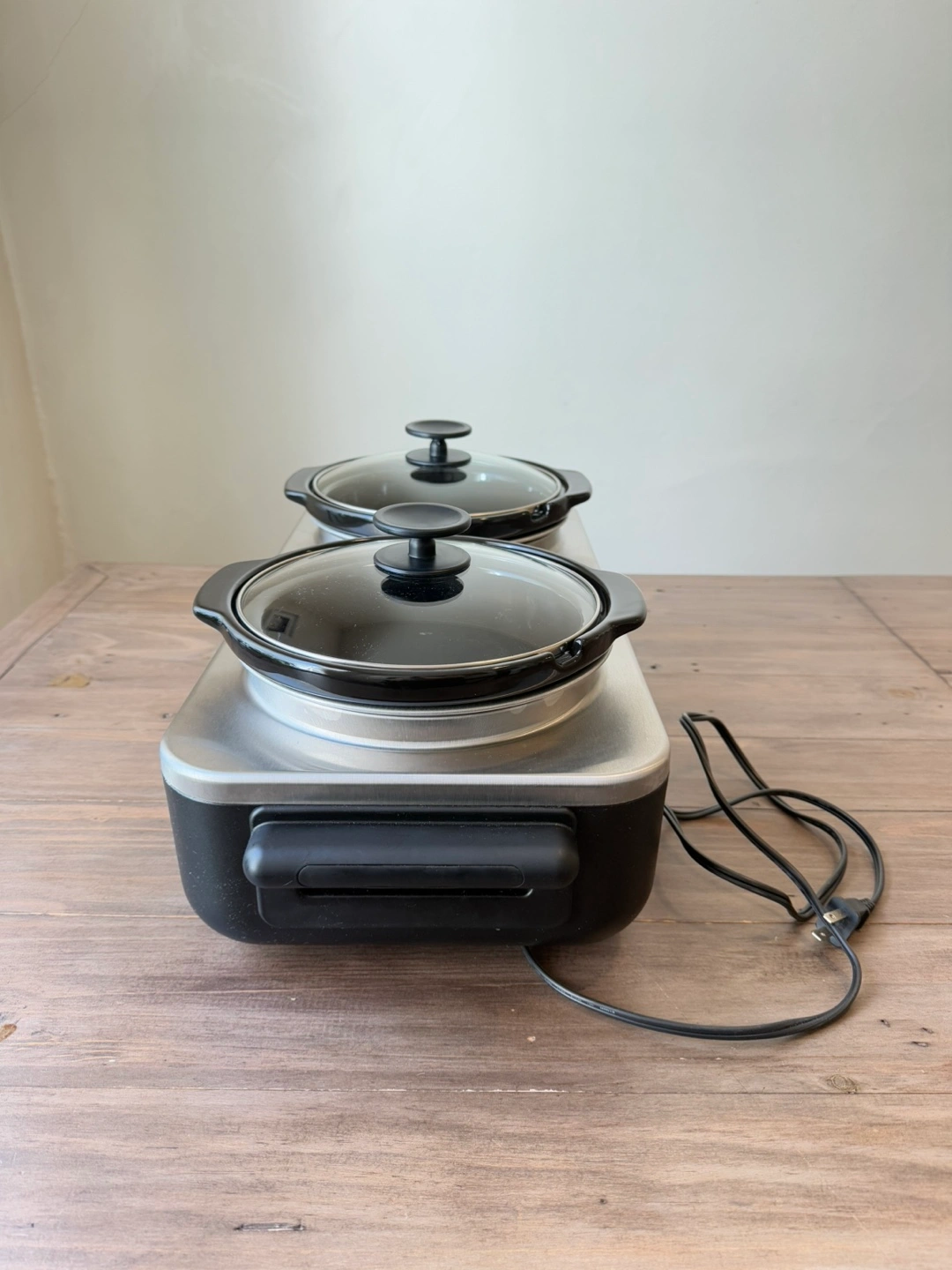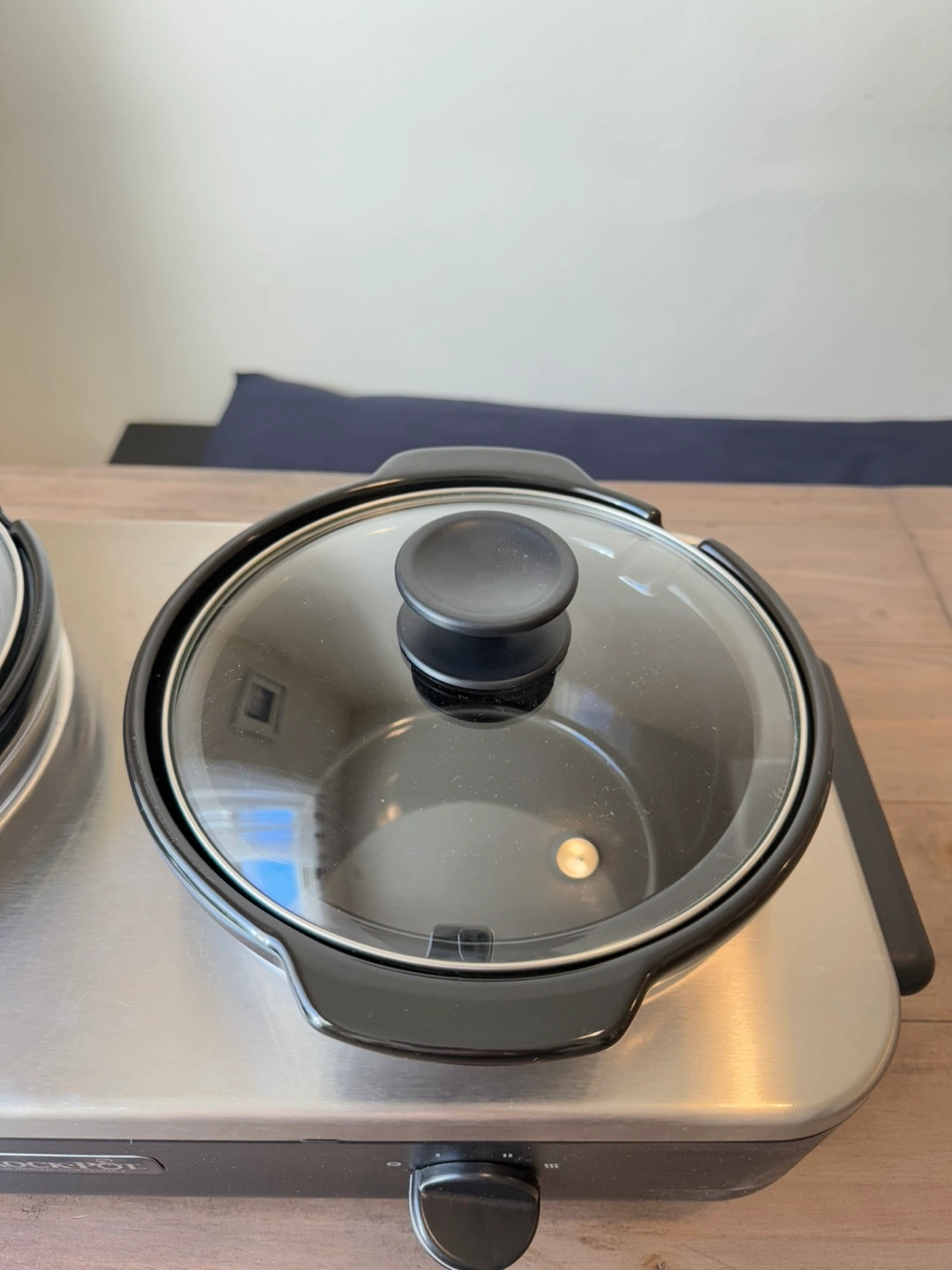 Official Crockpot™ brand slow cooker; only damage is a scratch on the right front corner (see photo). In perfect working condition; I just never reach for this anymore. Each pot comes with a glass lid and holds about 2 ¼ litres. Whole setup measures 22.5in long, 11in wide, 9in tall. Excellent for parties or large gatherings.