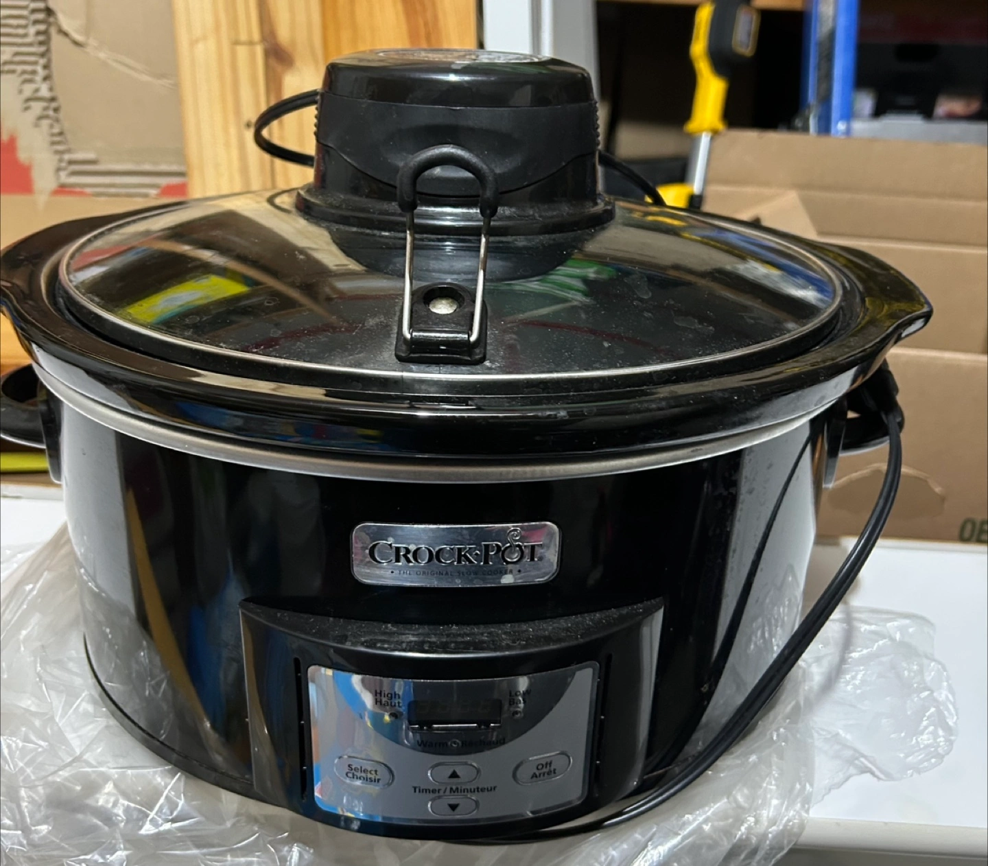 30Black slow cooker with glass lid. Features digital controls, timer and multiple heat settings. Includes power cord.