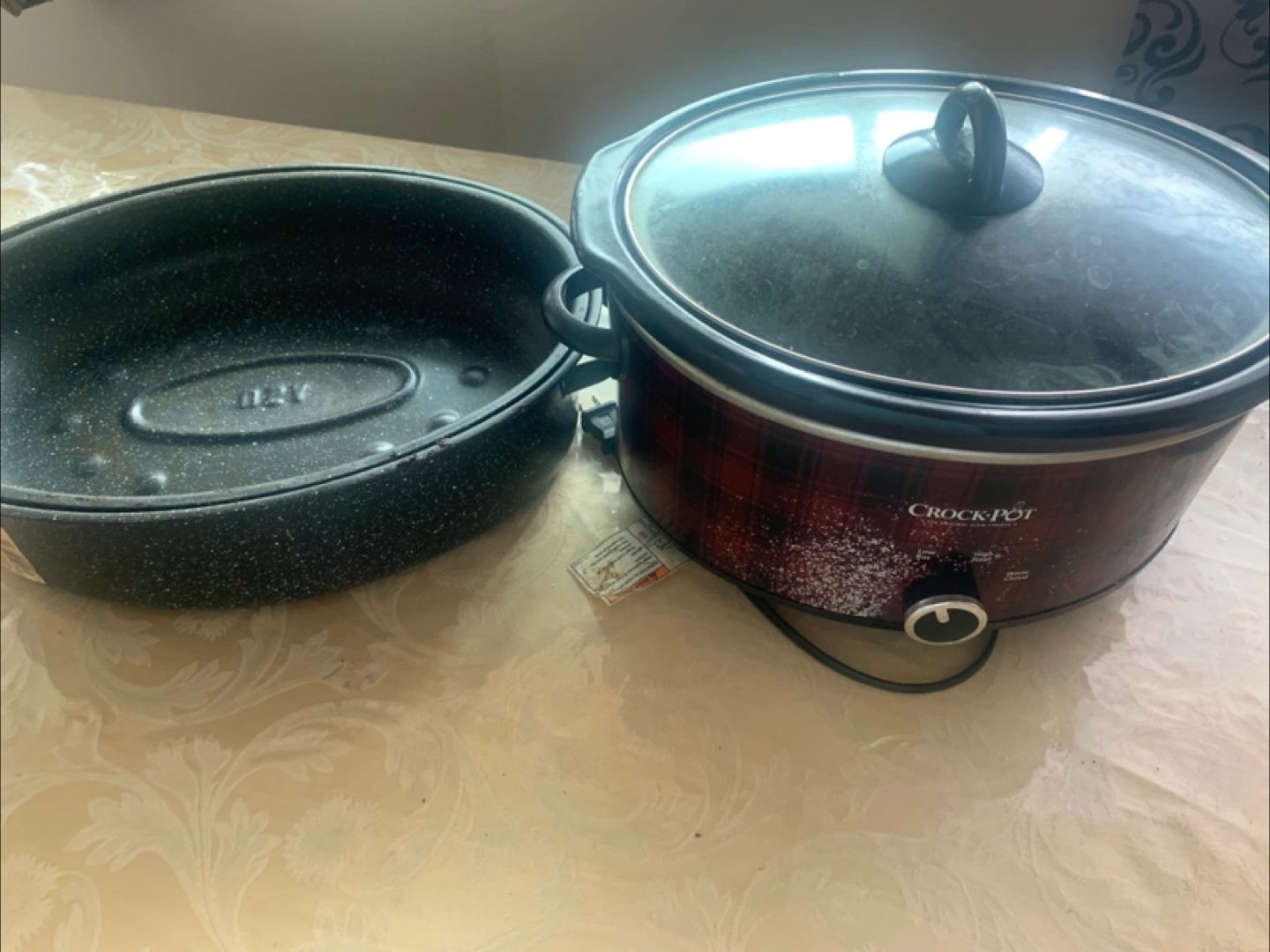 Matching pair of kitchen essentials. The slow cooker with a glass lid, and the roasting pan appear to be made of metal. You could use it for an easy way to prepare a family meal.