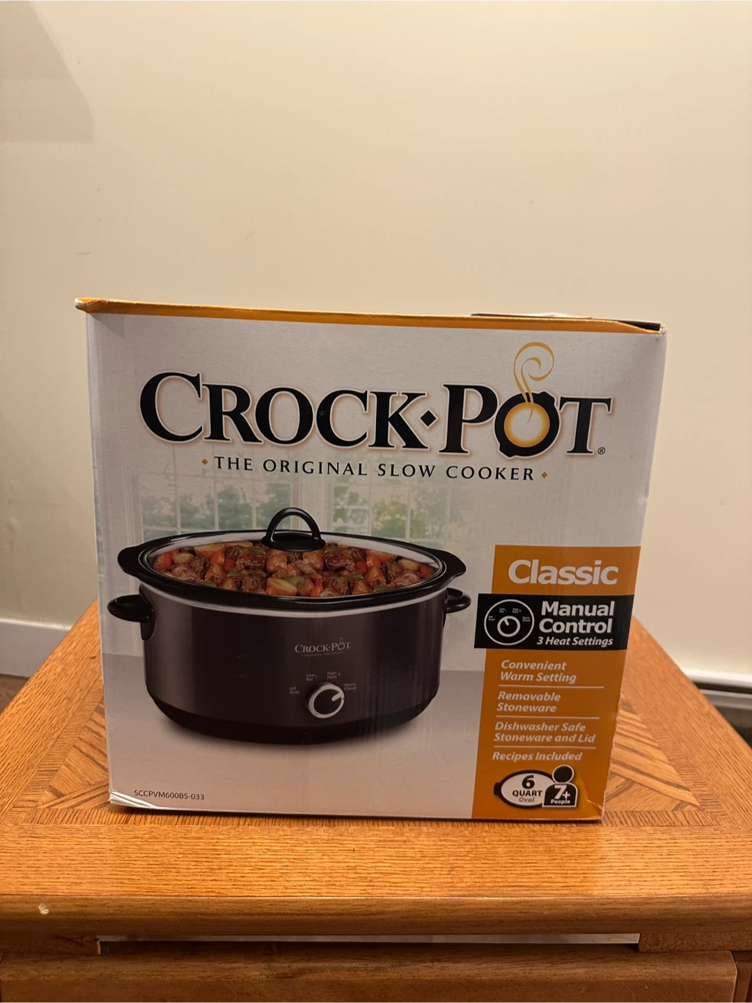 28Selling a Crock-Pot slow cooker, in box! It's the classic model with manual control and 3 heat settings. - Convenient warm setting - Removable stoneware - Dishwasher-safe stoneware and lid - Recipes included - 6 quart oval size, perfect for 7+ people