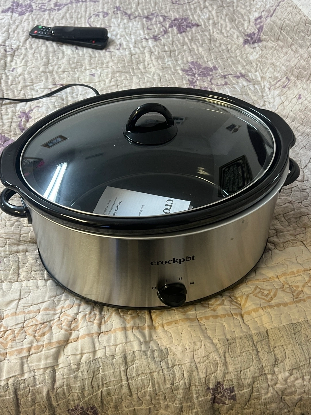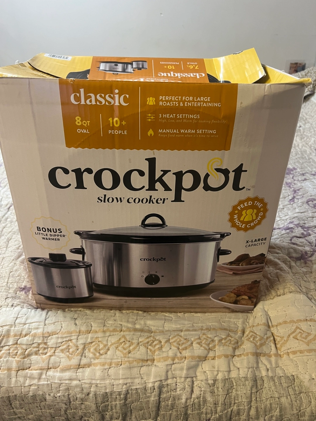 I'm selling a Crockpot slow cooker, perfect for large roasts and entertaining! This classic 8QT oval slow cooker can serve 10+ people. It features 3 heat settings for cooking flexibility and a manual warm setting to keep food warm until you're ready to serve. Also included is a bonus little dipper warmer! The box is included as well