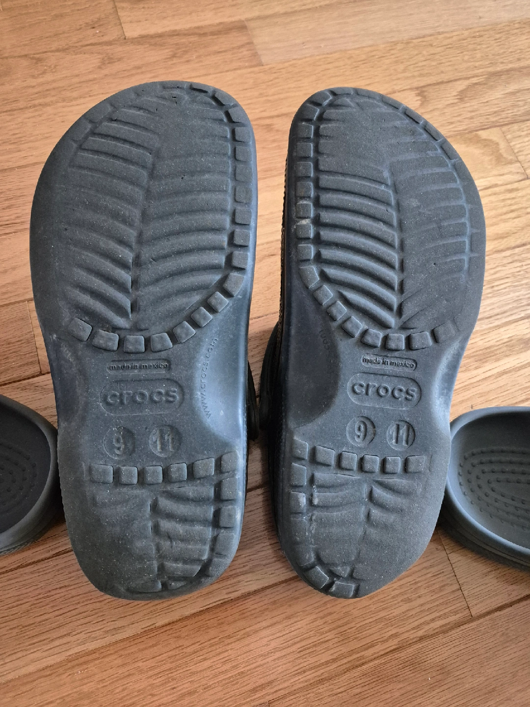 2 pairs of very good condition Crocs + I'll toss in a 3rd (worn) pair for free. β—‰ Pair 1: Black (no cut-out holes) in basically new condition, only worn a couple of times (indoors). Pics 2-5. β—‰ Pair 2: Dark Grey (with cut-out holes) is a little worn but still quite good condition with lots of life left. Pics 6-7. + β—‰ I'll include Pair 3 (free): Black (with cut-out holes), pretty worn, but useful for work around the house? Pics 8-9. πŸ“· See all photos. πŸ“ Size: Pairs 1+2 are marked M 11. Pair 3 (the more worn pair) is marked M9 W11. I'm a little confused, because they were all worn by the same person so should be the same size. Please see photos of size markings. βœ”οΈ All are dark neutral colours. πŸ‘‰ Pick up from Yonge + St Clair