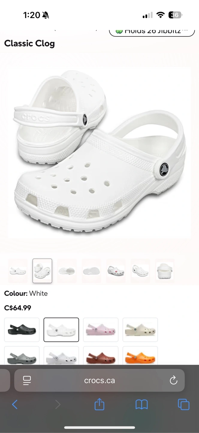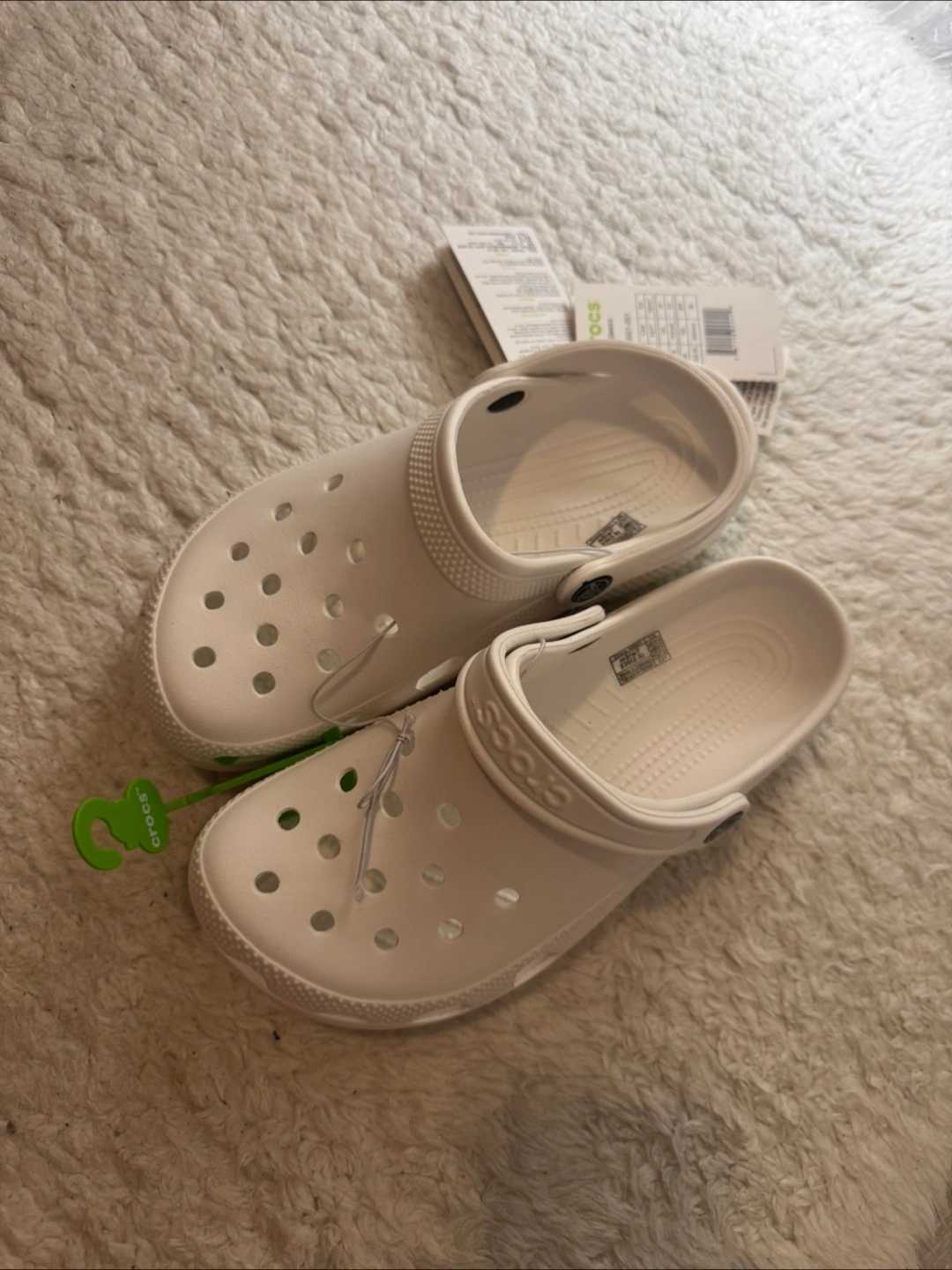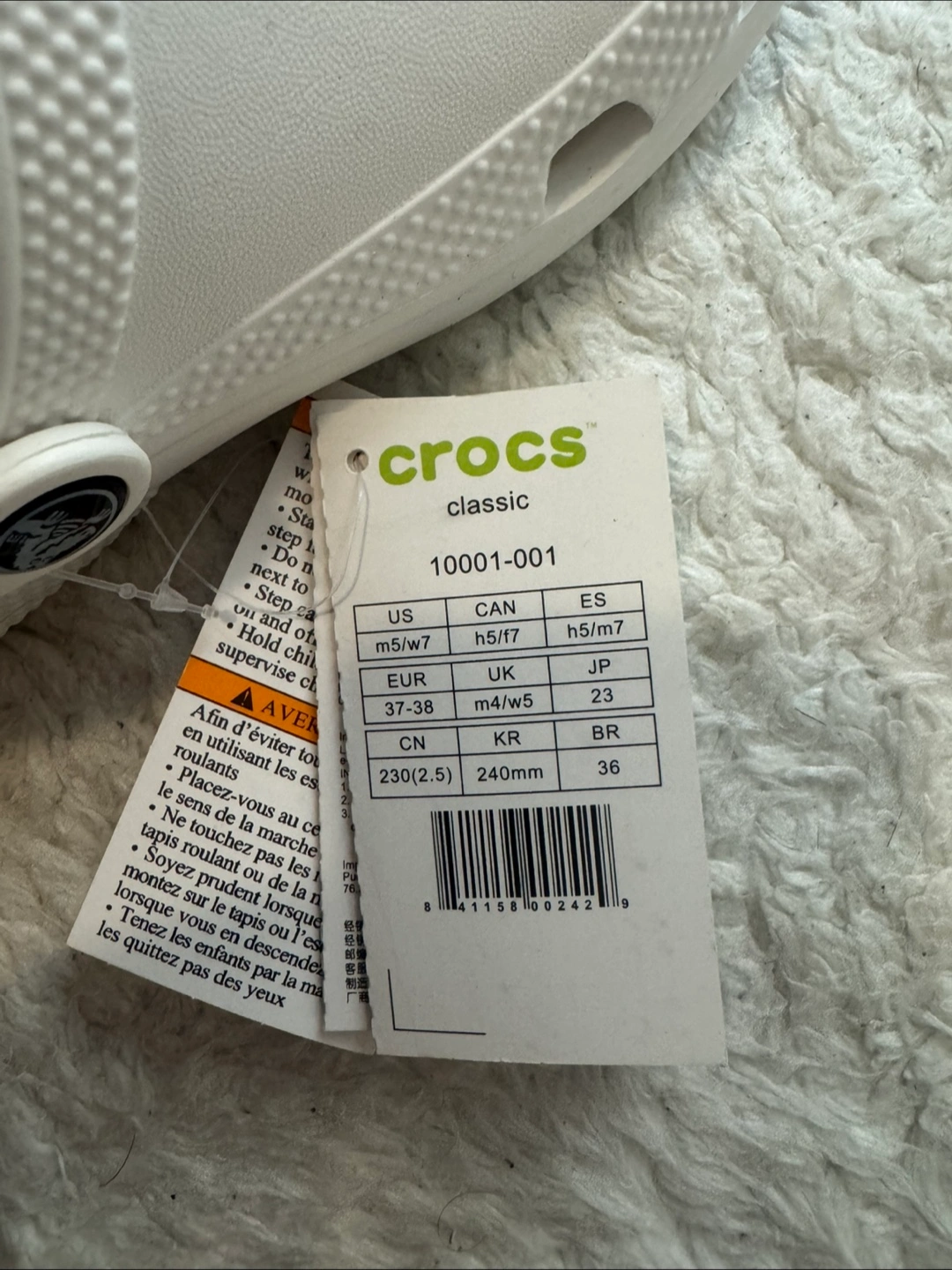 60Selling a pair of Crocs Classic Clogs in white! They're in great condition and super comfy for everyday wear. The size is US men's 5/women's 7, which is equivalent to a Canadian size of men's 5/women's 7. It’s brand new