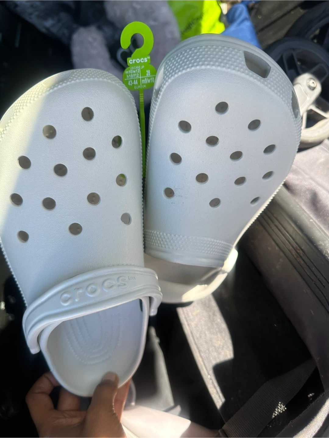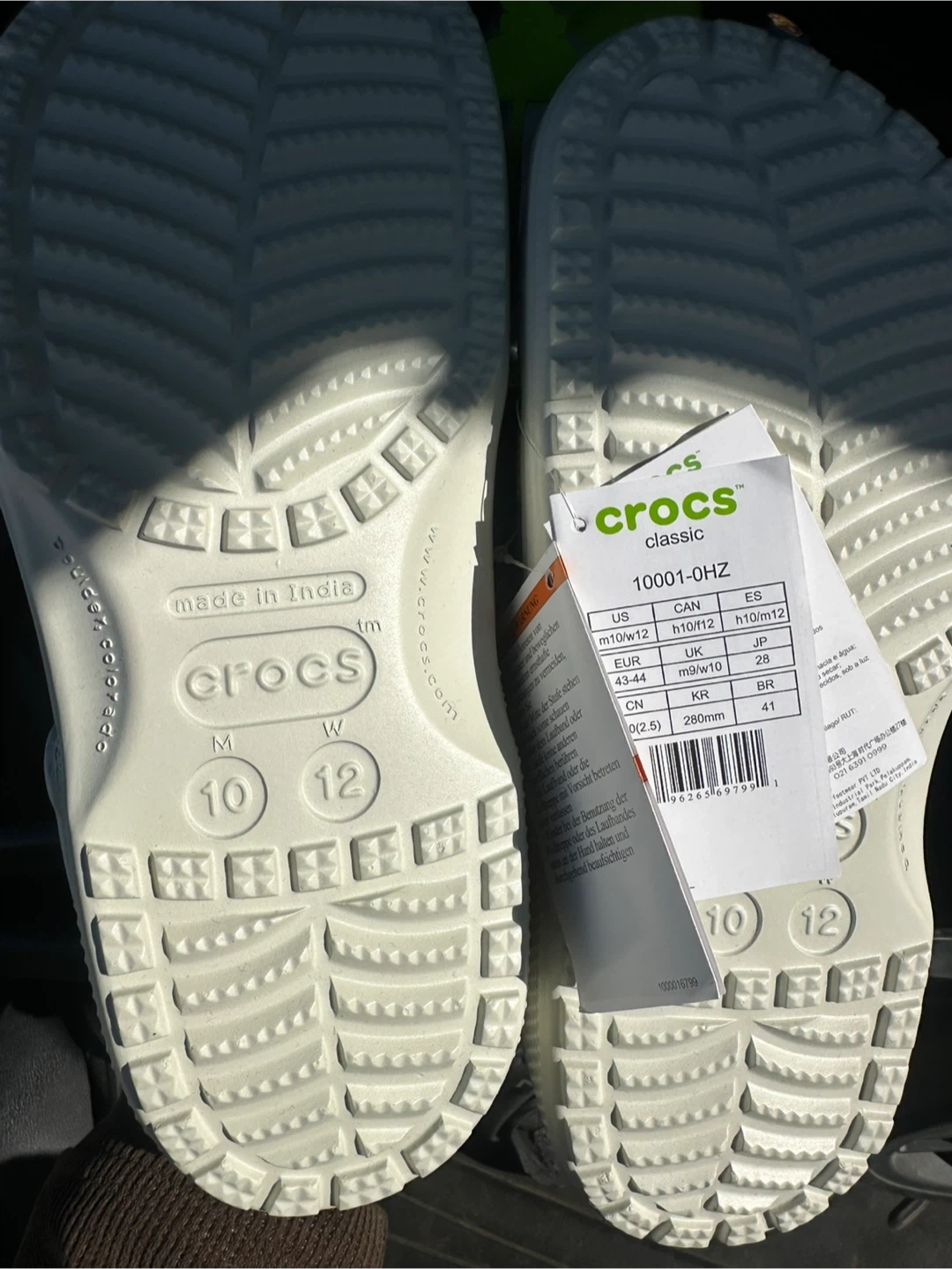 Selling a pair of Crocs Classic clogs in a clean, neutral colour! They're marked as men's size 10 and women's size 12. Super comfy and ready for a new home!