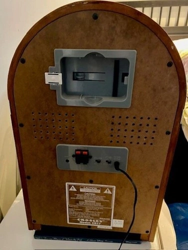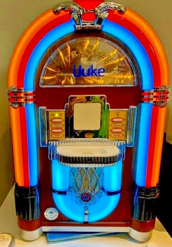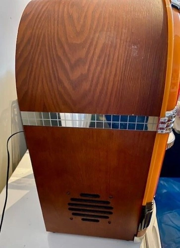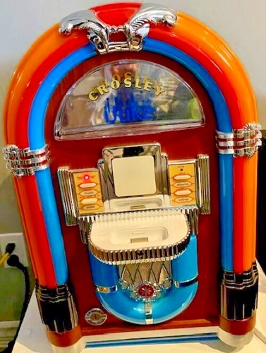 10The Crosley iJuke Jukebox is a vintage-inspired music player that combines the charm of a classic jukebox with modern technology. This model, from 2006, is designed to work with Apple iPods, allowing you to play your favourite tunes with ease. The colourful lights and built-in speaker create an immersive music experience, making it a perfect addition to any home entertainment setup. This original Crosley jukebox is a must-have for collectors and music enthusiasts alike. Approx Dimensions: Height- 49 cm Width - 33 cm Depth - 25 cm