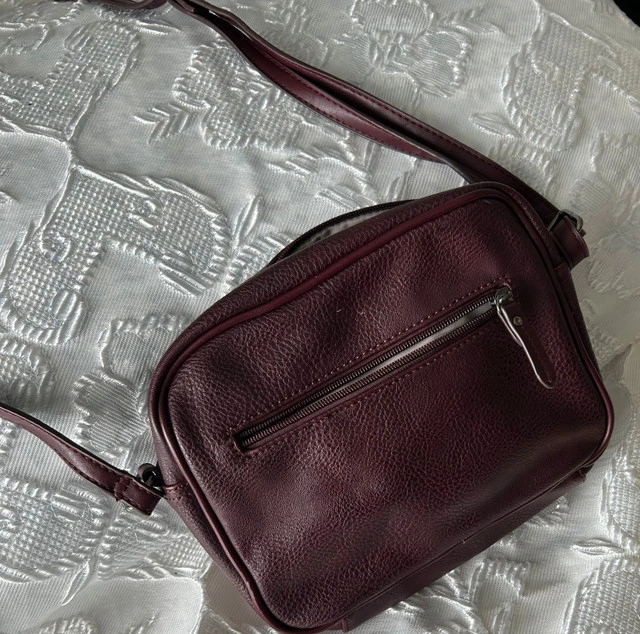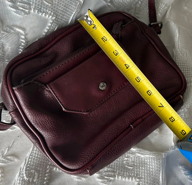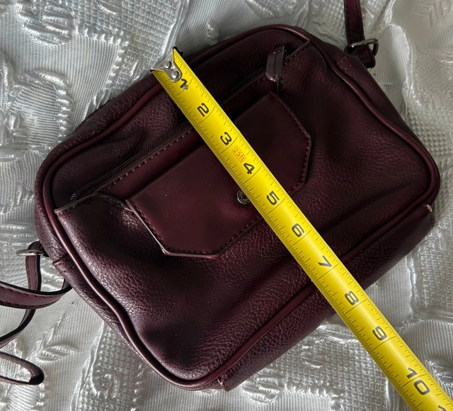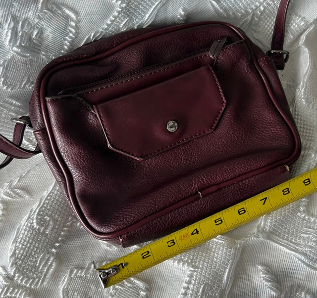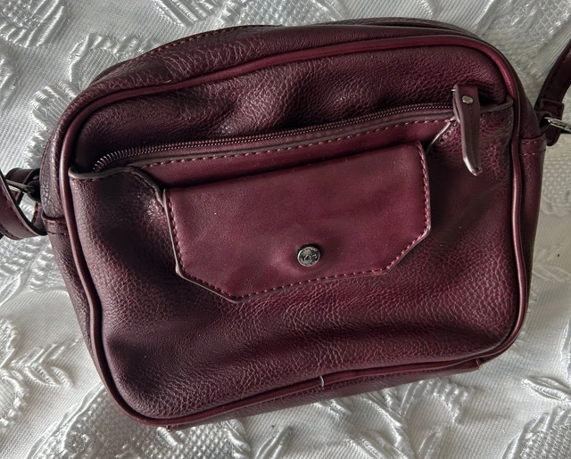 65This crossbody bag, in a beautiful, dark burgundy bag is perfect for keeping your essentials stylishly organized. It features a convenient front pocket and a zippered closure for added security. Note this is a used item. Features: - Type: Crossbody Bag - Colour: Dark burgundy - Condition: Used, in good condition - Front pocket with magnetic snap closure - Top zip closure - Adjustable shoulder strap