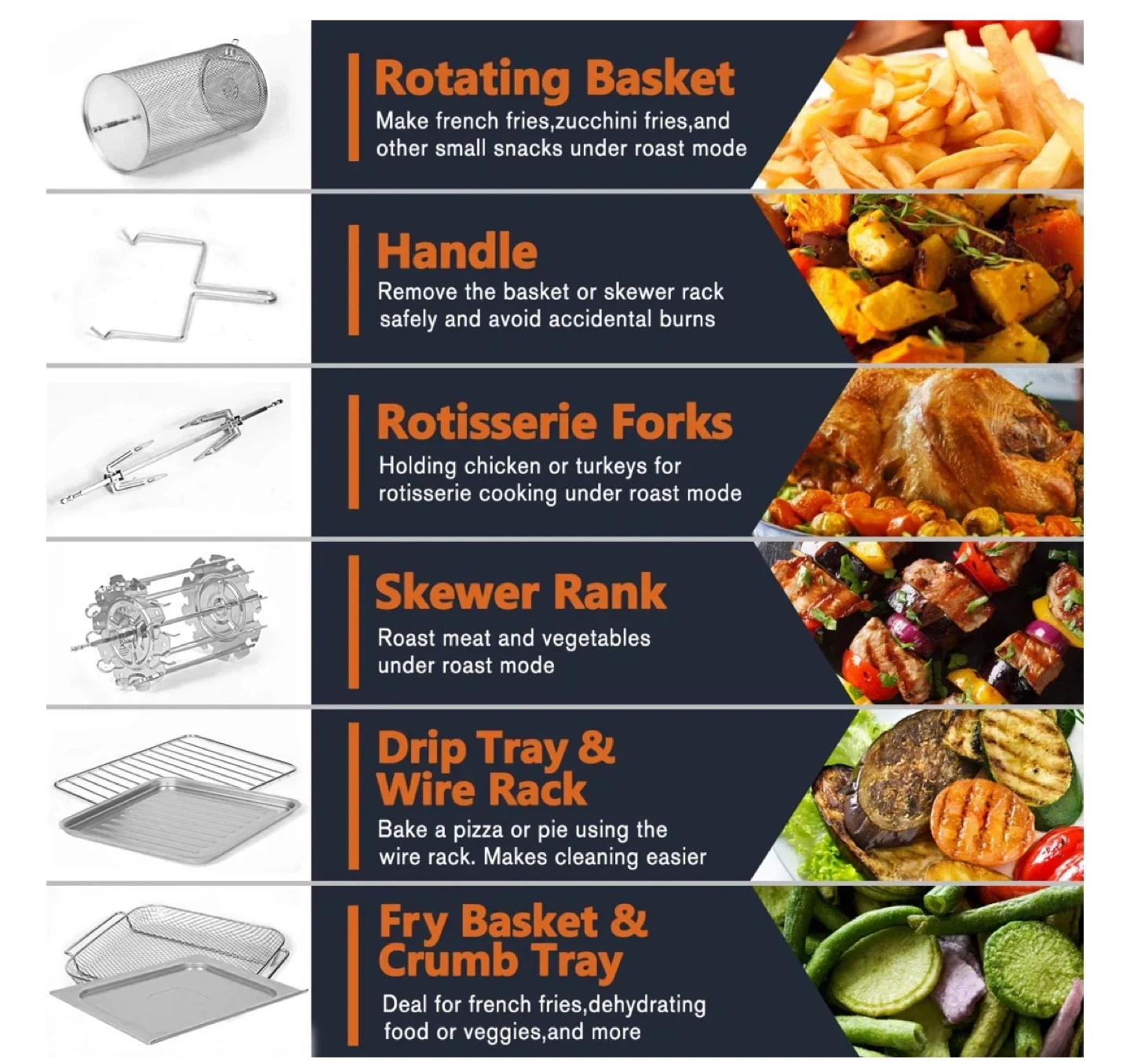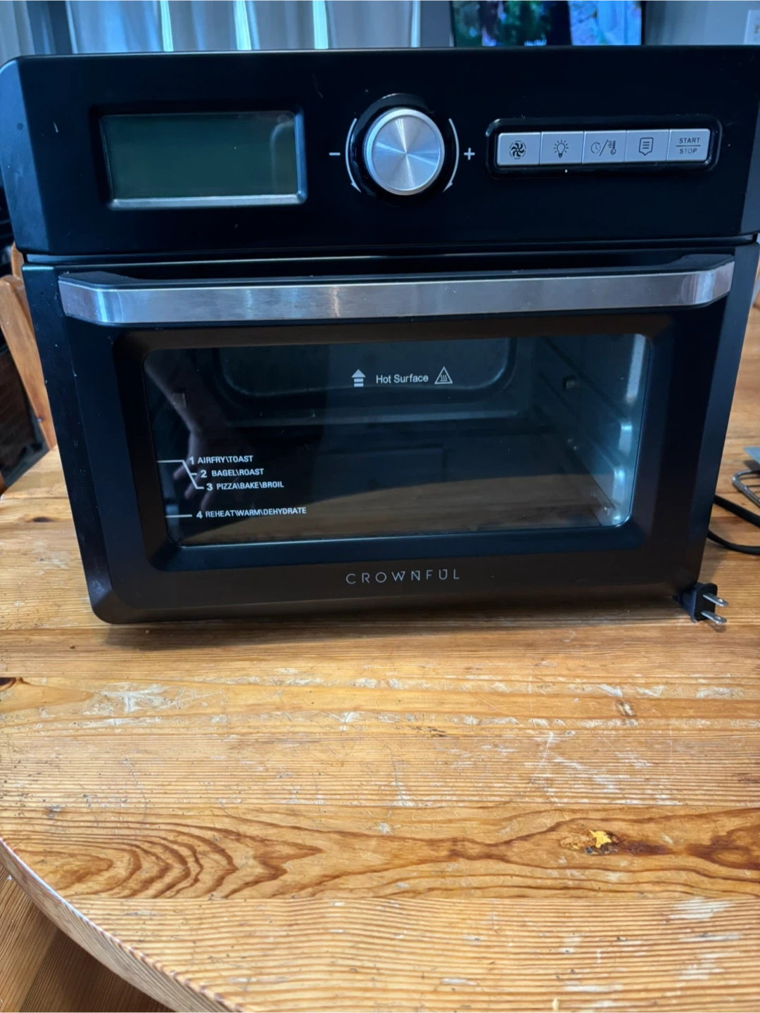 18Selling a Crownful air fryer oven. It comes with a rotating basket, handle, rotisserie forks, skewer rack, drip tray, wire rack, and fry basket/crumb tray. Perfect for making french fries, zucchini fries, roasting chicken or turkey, roasting meat and vegetables, baking pizza or pie, dehydrating food or veggies, and more