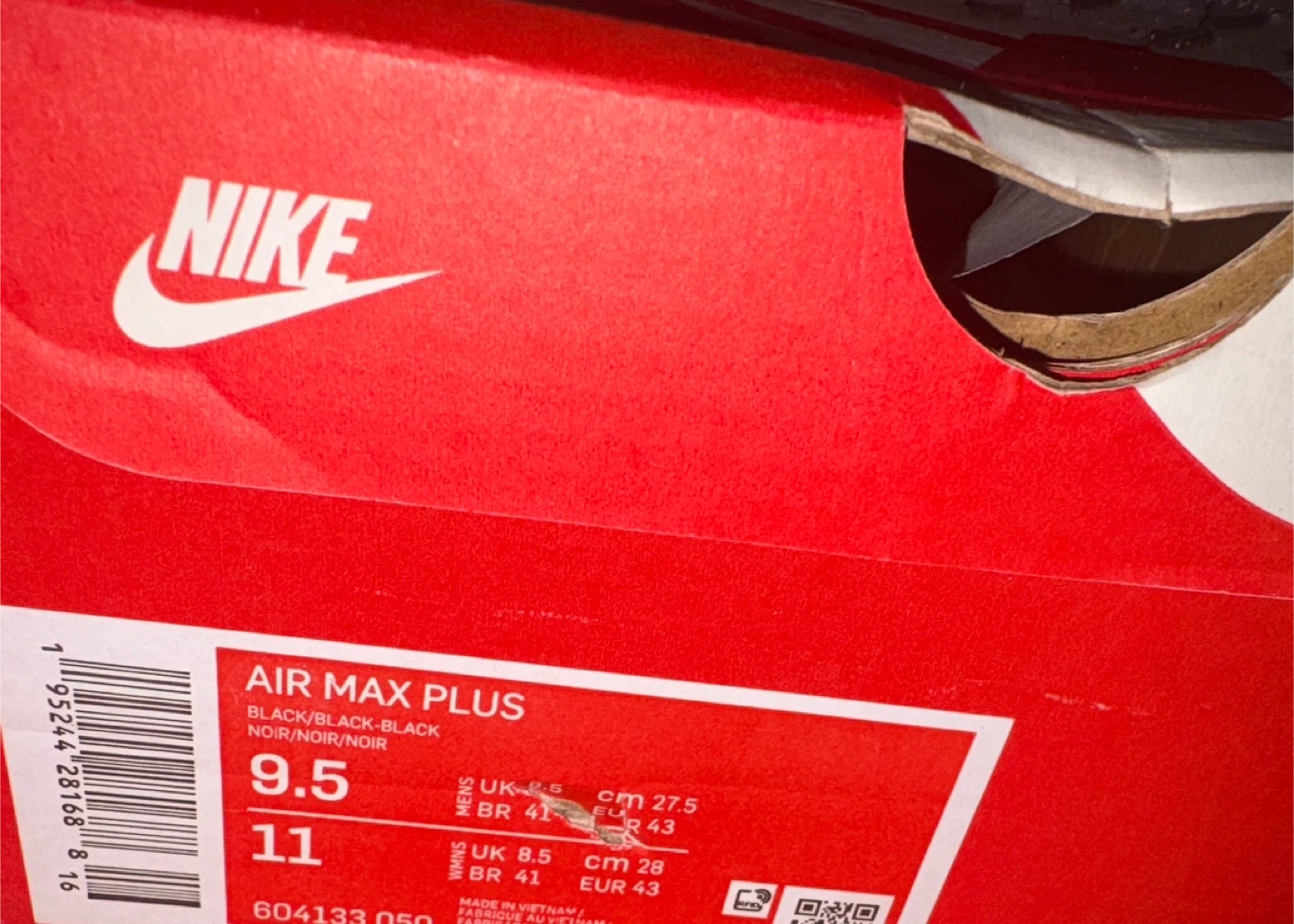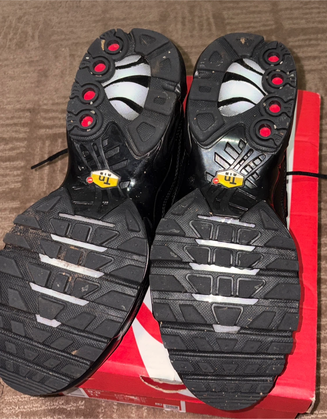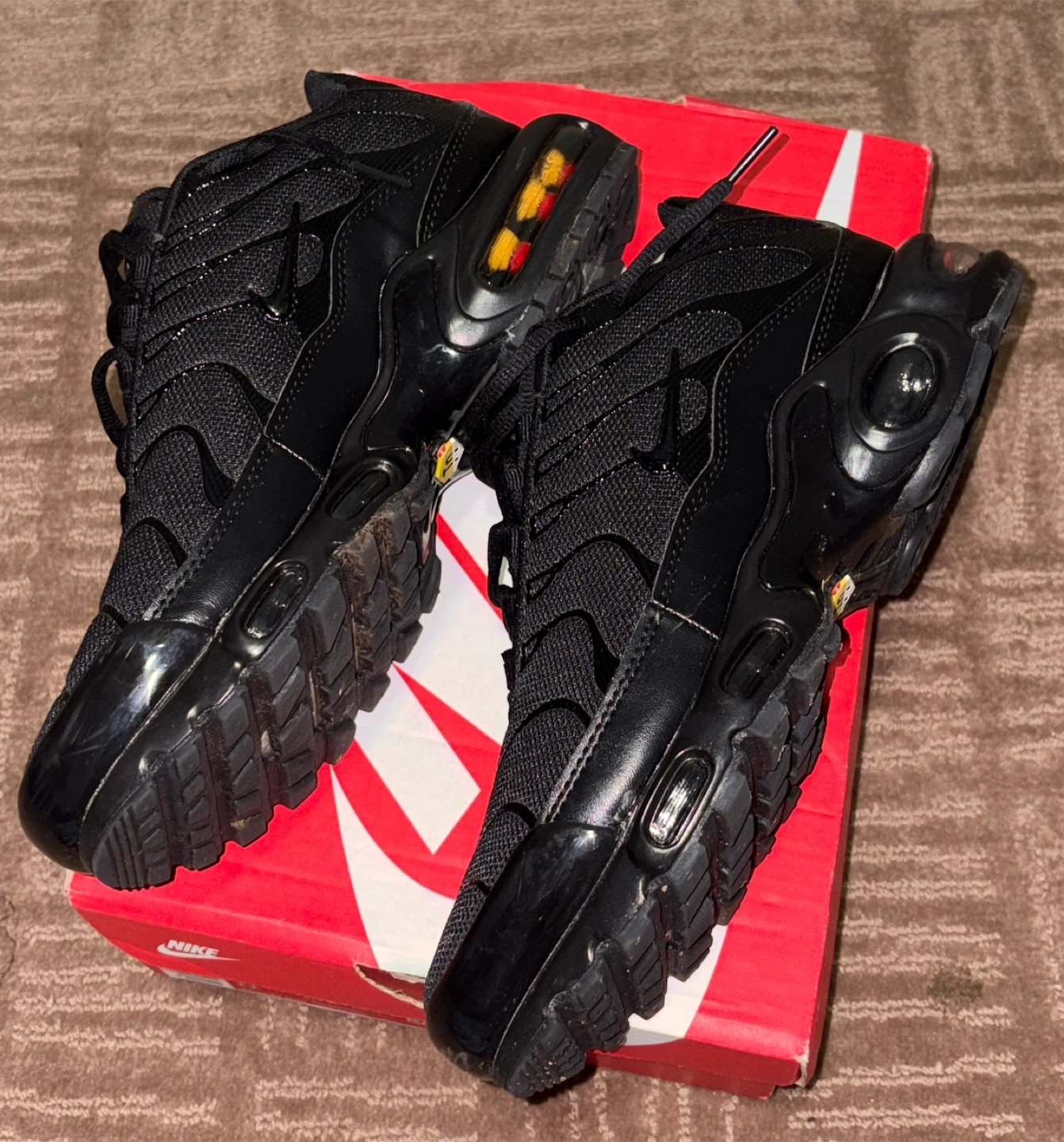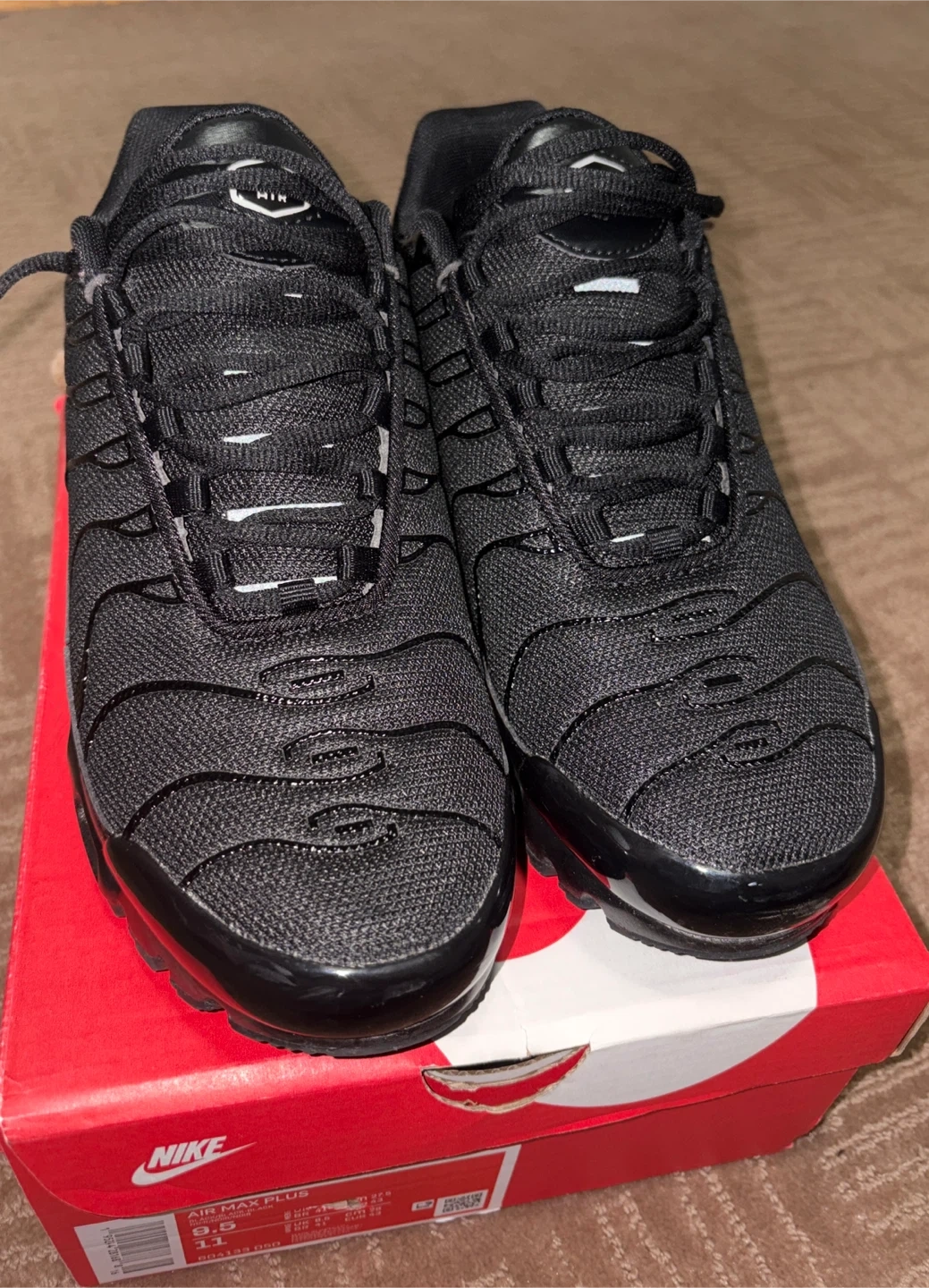 Men's black Nike Air Max Plus TN SE sneakers. Size US 9.5, EUR 43, CM 27.5. Comes with original box. These kicks offer a sleek look with the classic TN Air cushioning.