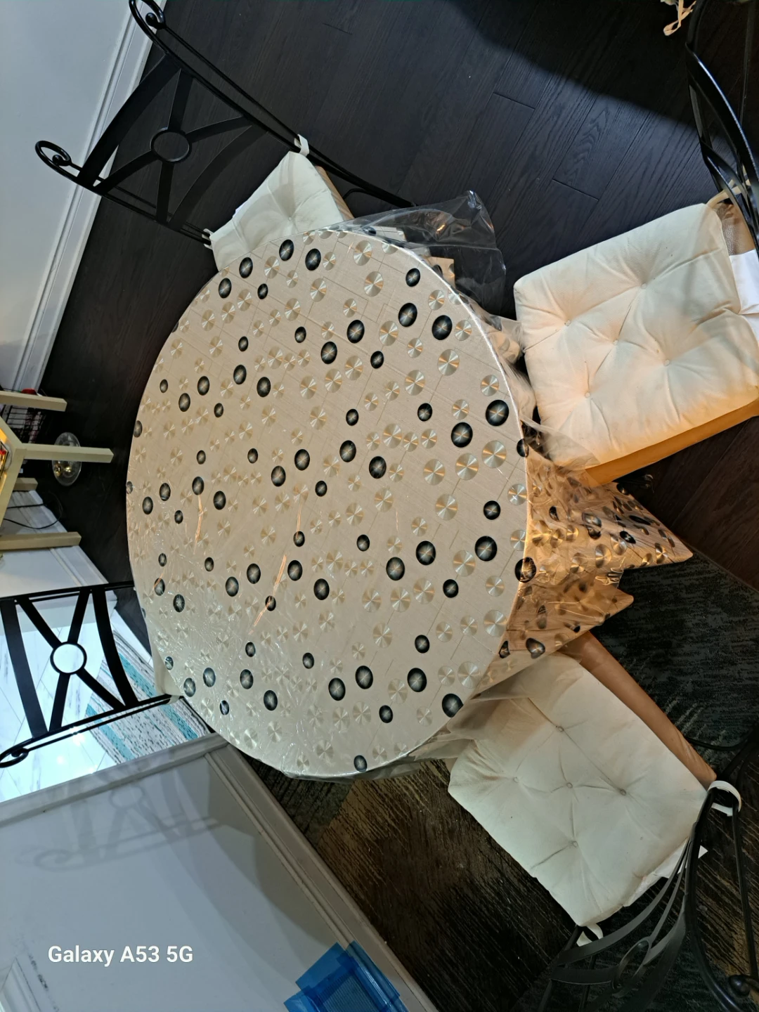 This round glass dining table set includes four metal chairs with cream-coloured cushions. The table has a metal frame and a clear glass top. The chairs feature a decorative backrest design. It's perfect for a breakfast nook or a smaller dining area.