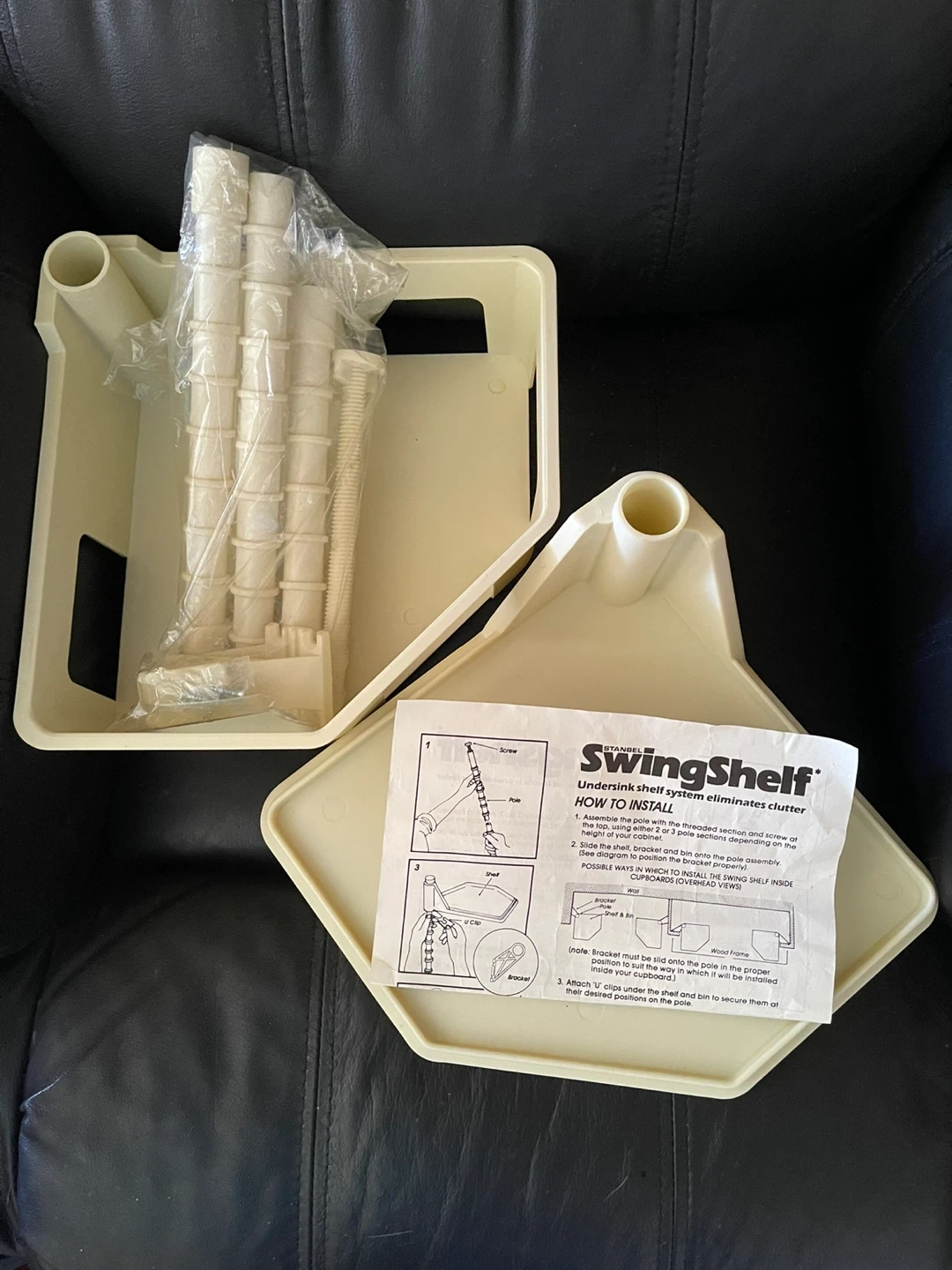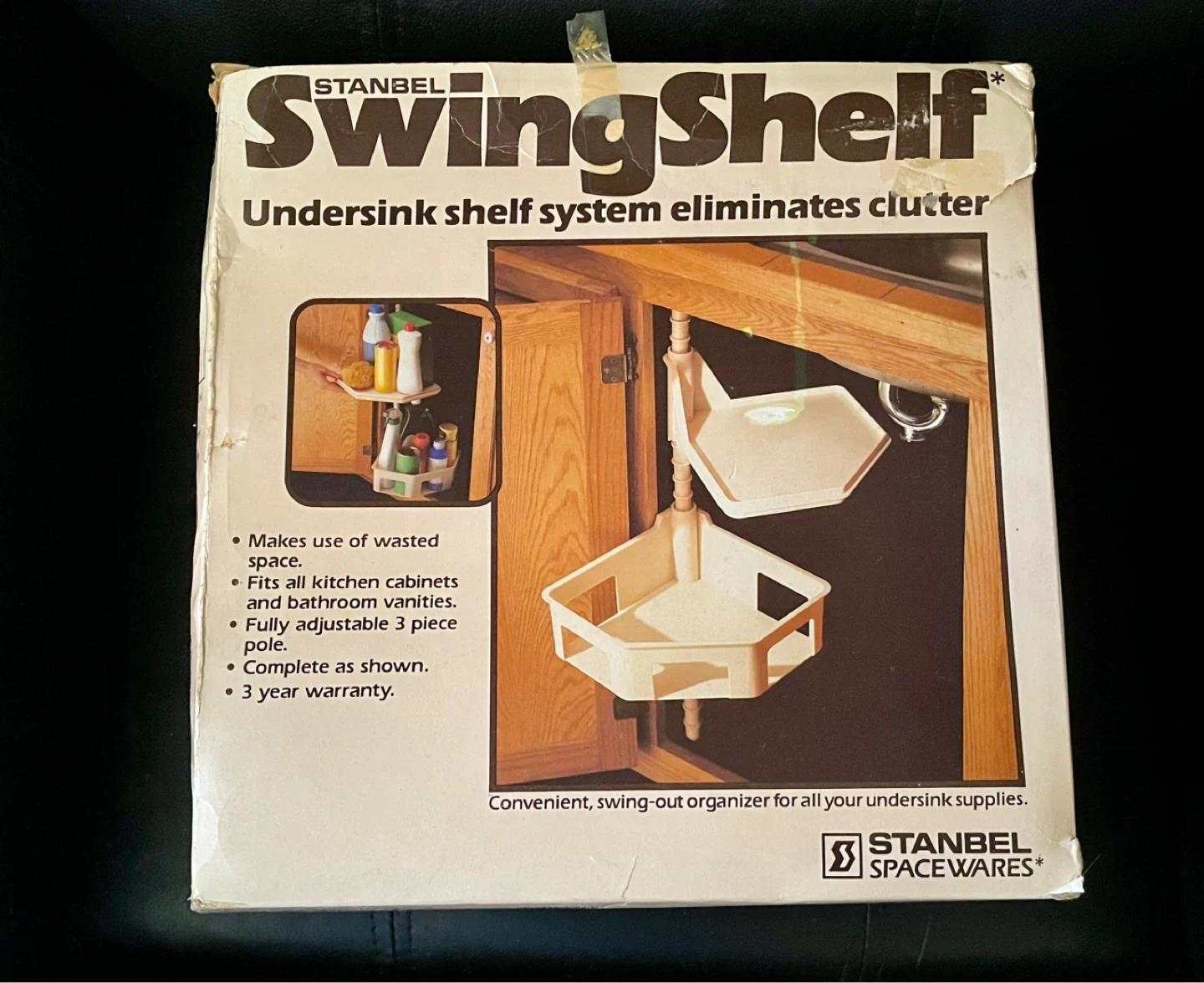 This is a Stanbel SwingShelf undersink shelf system. It's designed to eliminate clutter and make use of wasted space. Fully adjustable, 3-piece pole. This item is vintage but unused and contains all the parts plus the instructions. The box has minor damage.