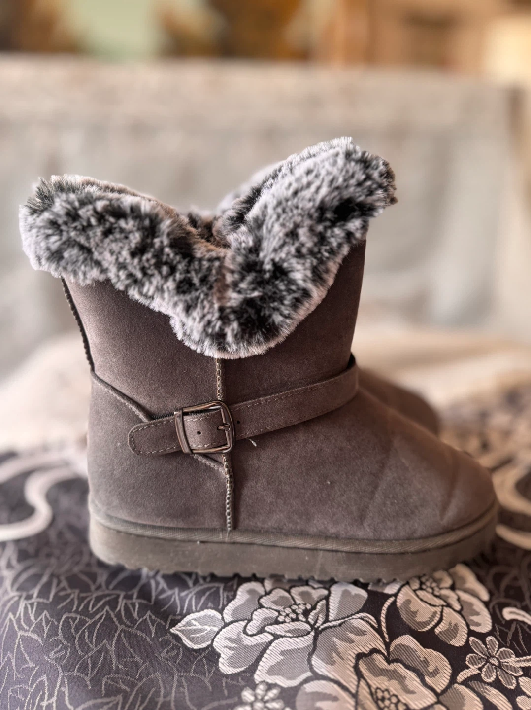 Comfy winter boots in a versatile grey colour. They feature a faux suede exterior with a cozy faux fur lining and trim. A buckle strap adds a stylish detail. Perfect for keeping your feet warm during colder months!